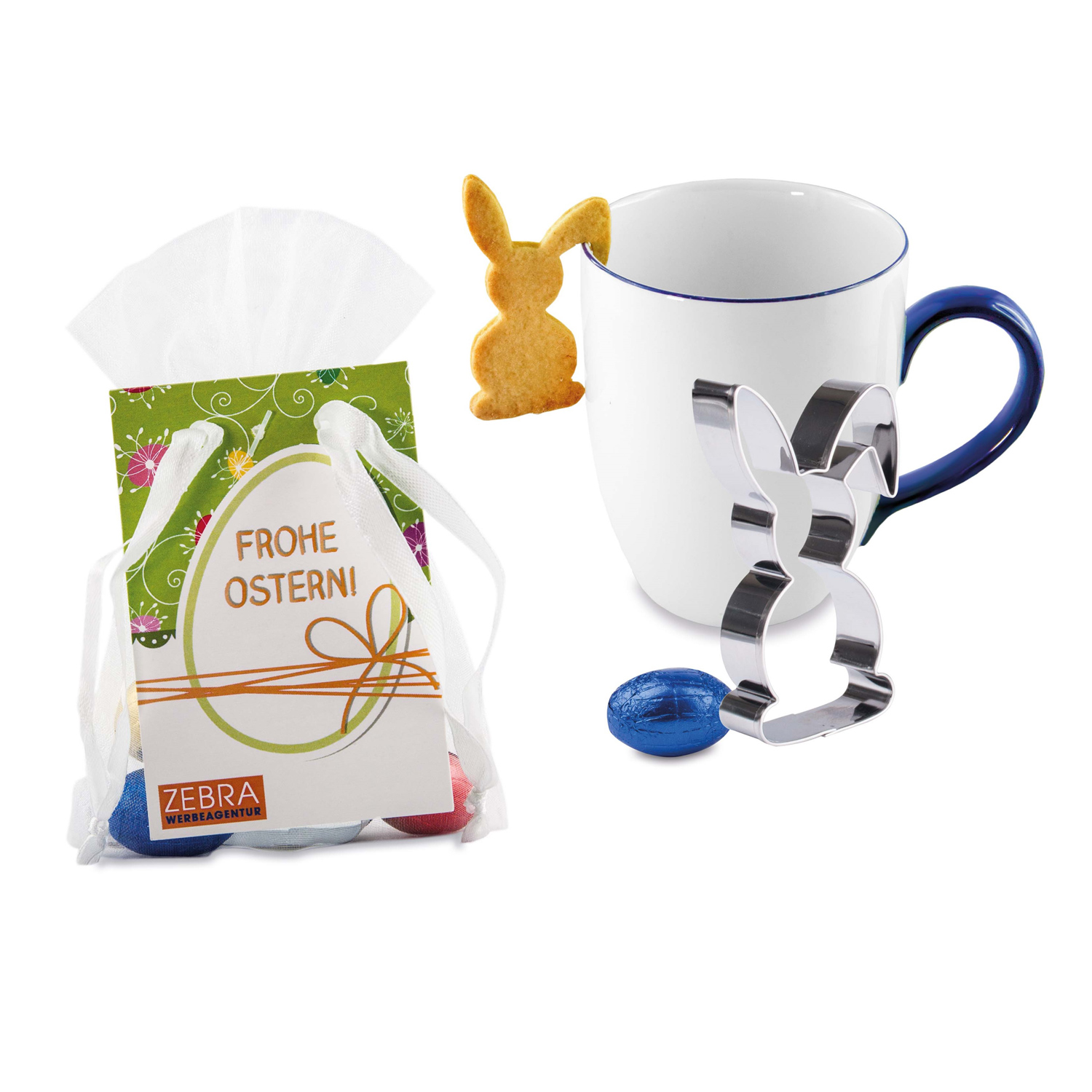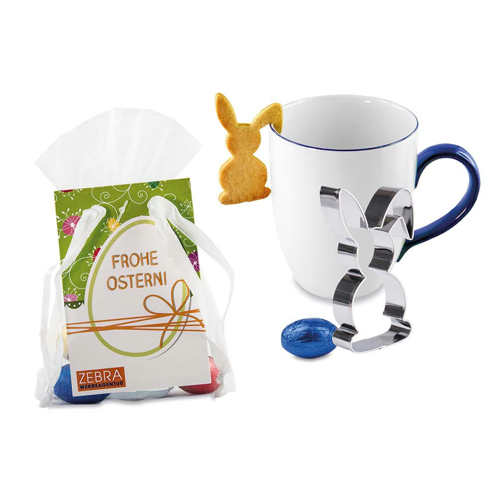 Sypmpathisches Oster-Ausstechförmchen aus Edelstahl. Der Clou: Ein Hasenohr ist so geformt, dass das fertige Osterhasenplätzchen direkt an den Tassenrand gehangen werden kann. Das Backförmchen wird zusammen mit 3 Schokoeiern in einem Organzasäckchen geliefert, der angebrachte Hangtag kann auf der Vorder- und Rückseite in 4-c-Euroskala gestaltet werden.