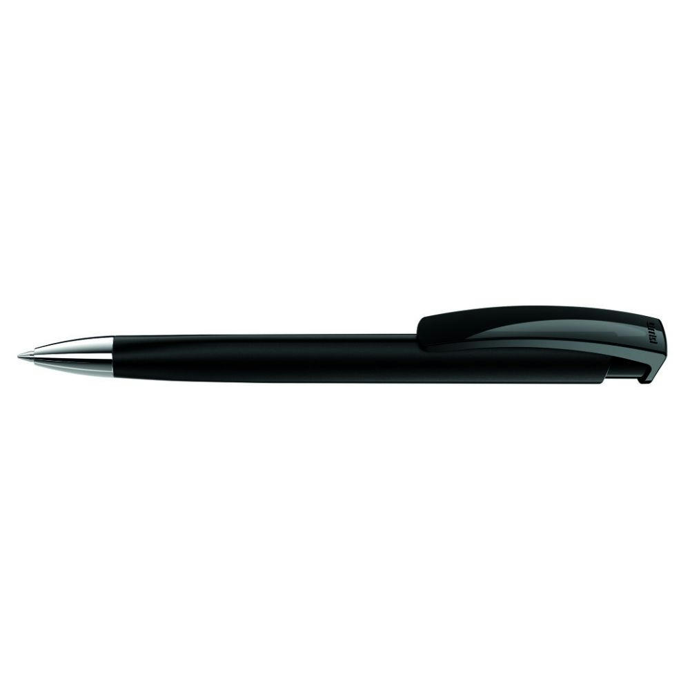 Druckkugelschreiber mit gedeckt glänzendem Dreikantgehäuse und schwerer Metallspitze glanzverchromt.