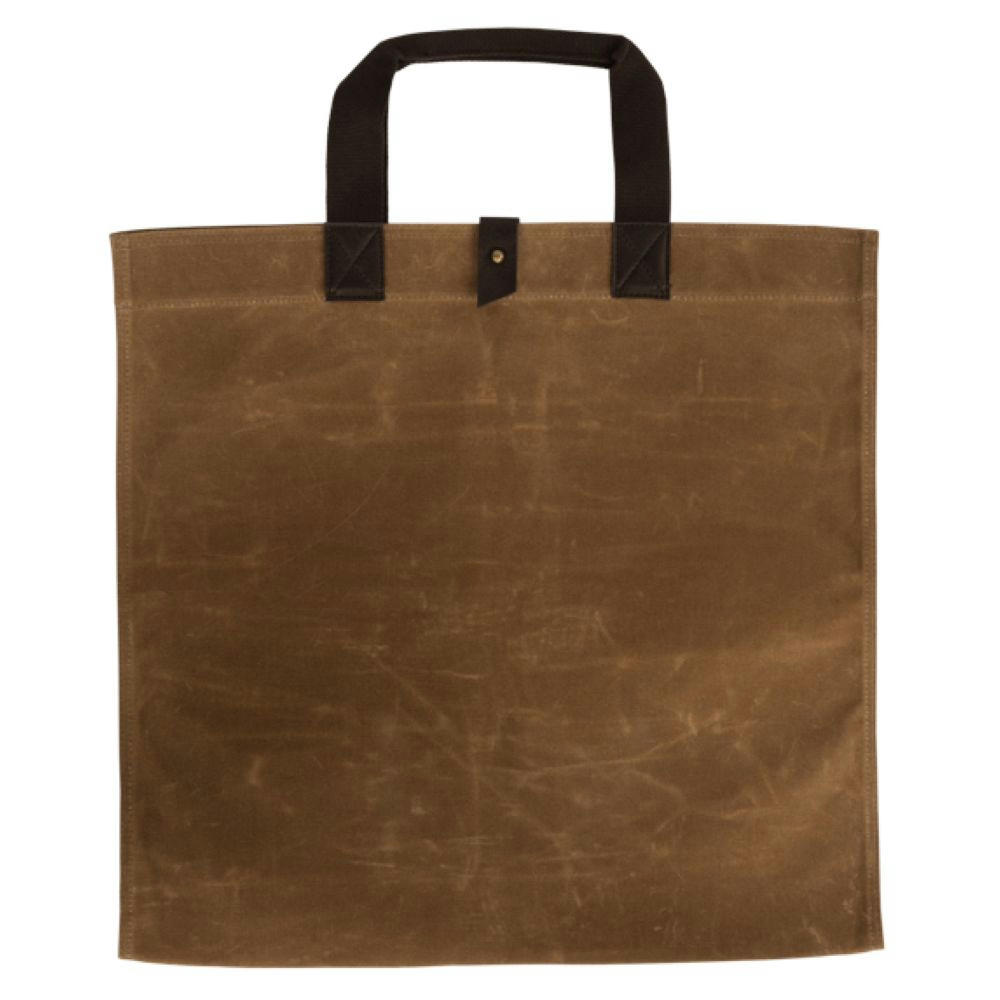 Gewachste Baumwolle, Träger aus dunkelbraunem Webband, Akzente in Lederimitat.