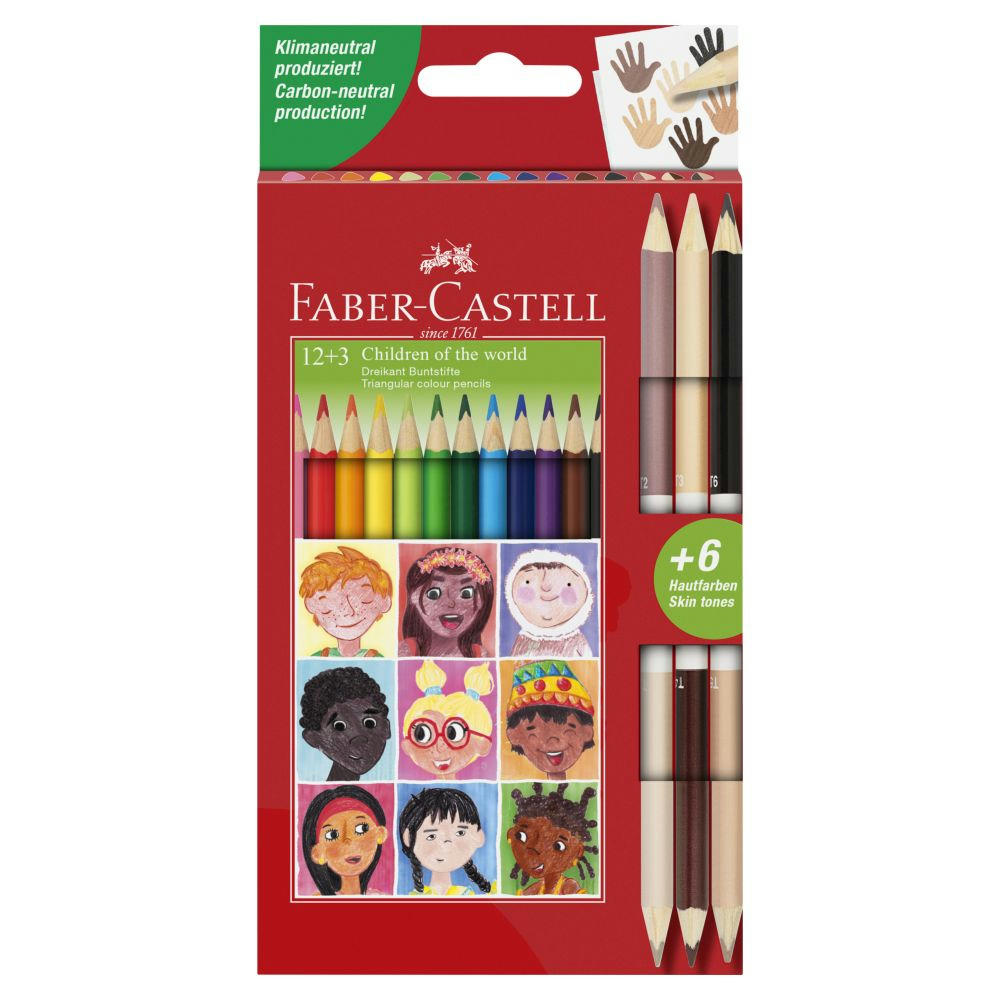 Set mit 12 Buntstiften und 3 Bicolour mit insgesamt 6 Hautfarbtönen. Die brillanten Farbstifte malen weich und haben eine bruchsichere Mine. Auswaschbar aus den meisten Textilien.