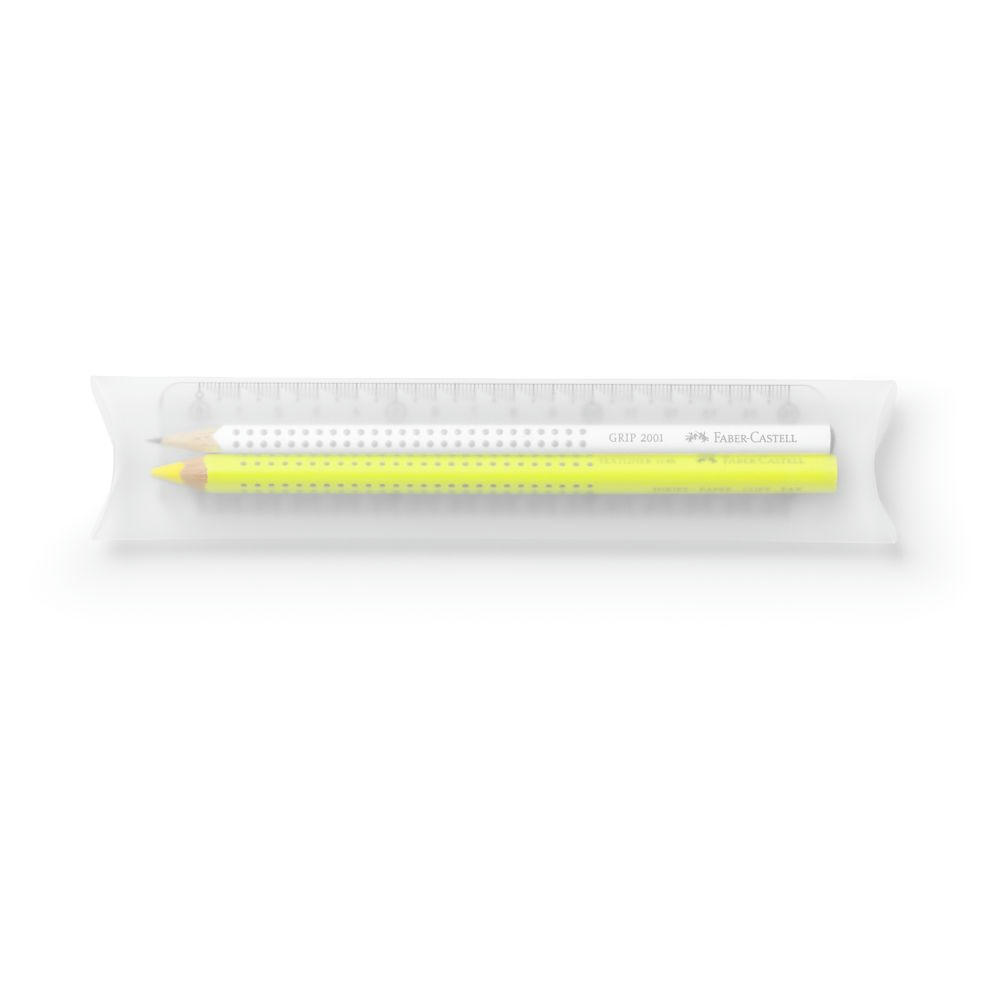 Set: Lineal, Bleistift Grip 2001 und Drylighter Lineal: bruchsicher und formstabil mit Grip-Zone und Anti-Reflex-Skalierung Bleistift: ergonomische Dreikantform, Soft-Grip-Zone, Lackierung mit umweltverträglichem Wasserlack Grip Drylighter: extra weich, leuchtstark, 5,4 mm Mine (für dünnes Papier geeignet). Preis inkl. 1c Druck auf Drylighter und Bleistift
