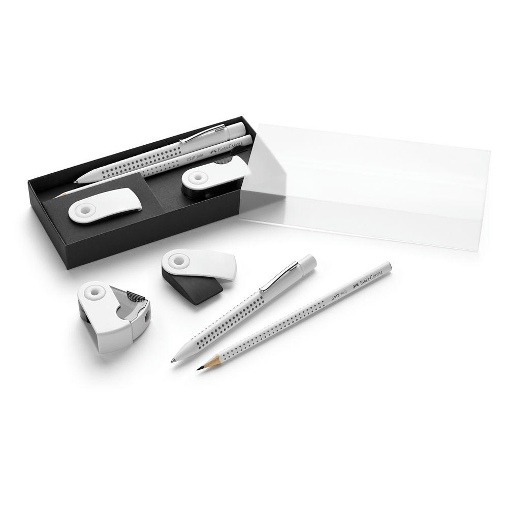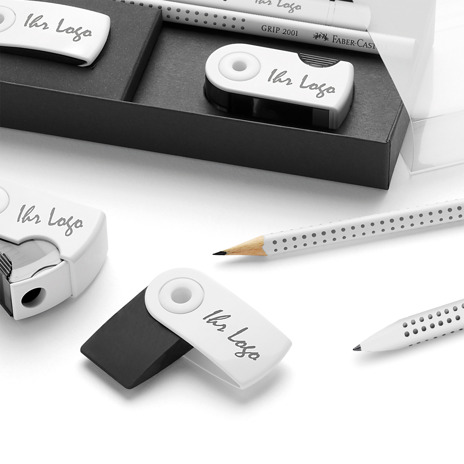 Bestehend aus: Kugelschreiber »GRIP 2010«, Bleistift »GRIP 2001« mit umweltfreundlicher Wasserlackpolitur, Einfachspitzdose und PVC-freiem Qualitätsradierer »Sleeve Mini«. In Geschenkverpackung mit Schuber. Preis inkl. 1c-Druck auf Spitzer, Radierer und Kugelschreiber