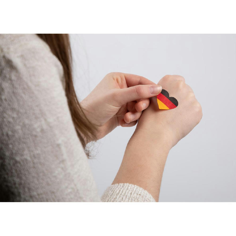 Set mit Pflastern in Herz-Form. 4-farbiger Papiereinleger (55 x 75 mm) und Polybeutel inklusive. Optimal als Körperschmuck oder Aufkleber für Textilien geeignet. Hergestellt nach den Vorschriften für medizinische Fixierpflaster. Beim Einleger kann zwischen Standard (siehe Abbildung) oder einem individuell gestalteten Einleger gewählt werden.