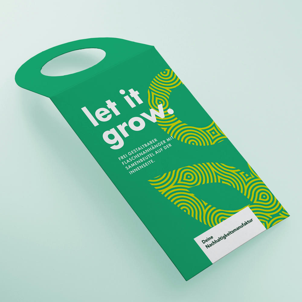 Frei gestaltbarer Flaschenanhänger mit Premium Samenbeutel „Artenglück 5 m²“ auf der Rückseite. Ein kommunikativer Mehrwert für Getränke, Öle o.ä.