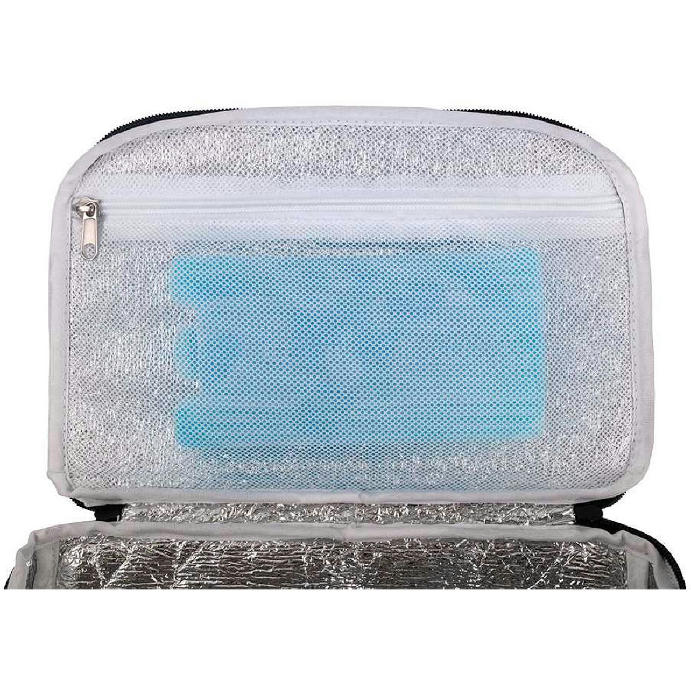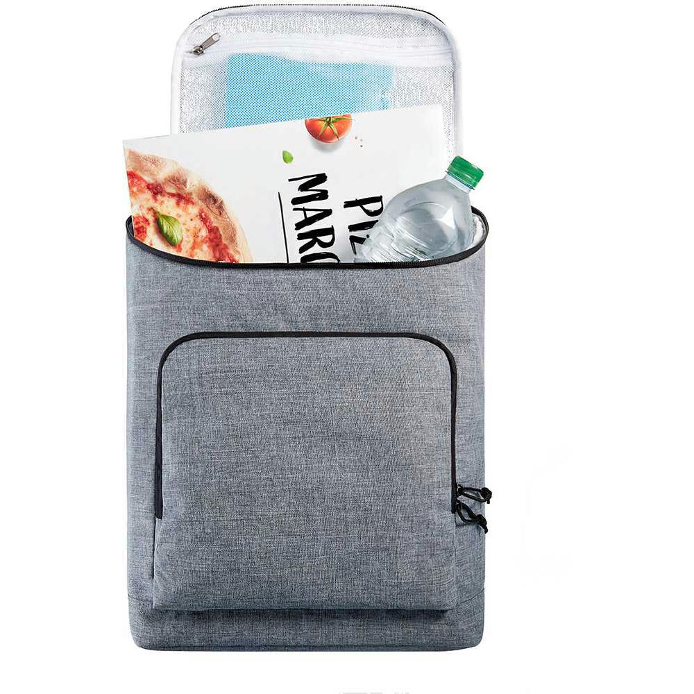 Deckel mit dreiseitig umlaufendem 2-Wege-Reißverschluss - ideal zum Befüllen; großes Hauptfach; Reißverschluss-Netzfach für Kühl-Akkus innen; außen Deckel-Reißverschlussfach; große Vortasche mit 2-Wege-Reißverschluss; gepolsterter Rücken; gepolsterte, längenverstellbare Schultergurte; Handgriff.
