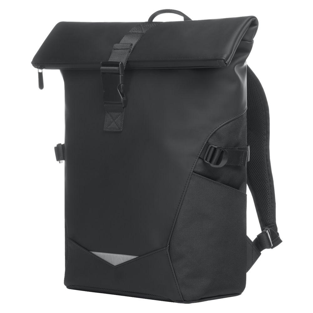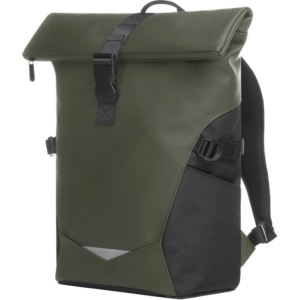 Rolltop-Rucksack; Reißverschluss-Hauptfach mit Steckverschluss; große Reißverschluss-Vortasche; zwei seitliche Einsteckfächer; Fixiergurte; Reflexeinsatz auf der Front; innen gepolstertes Einsteckfach mit Klettsicherung; verstecktes Reißverschluss-Fach rückseitig; gepolstertes Tragesystem mit individuell einstellbarem Brustgurt; Hand- sowie Tragegriff.