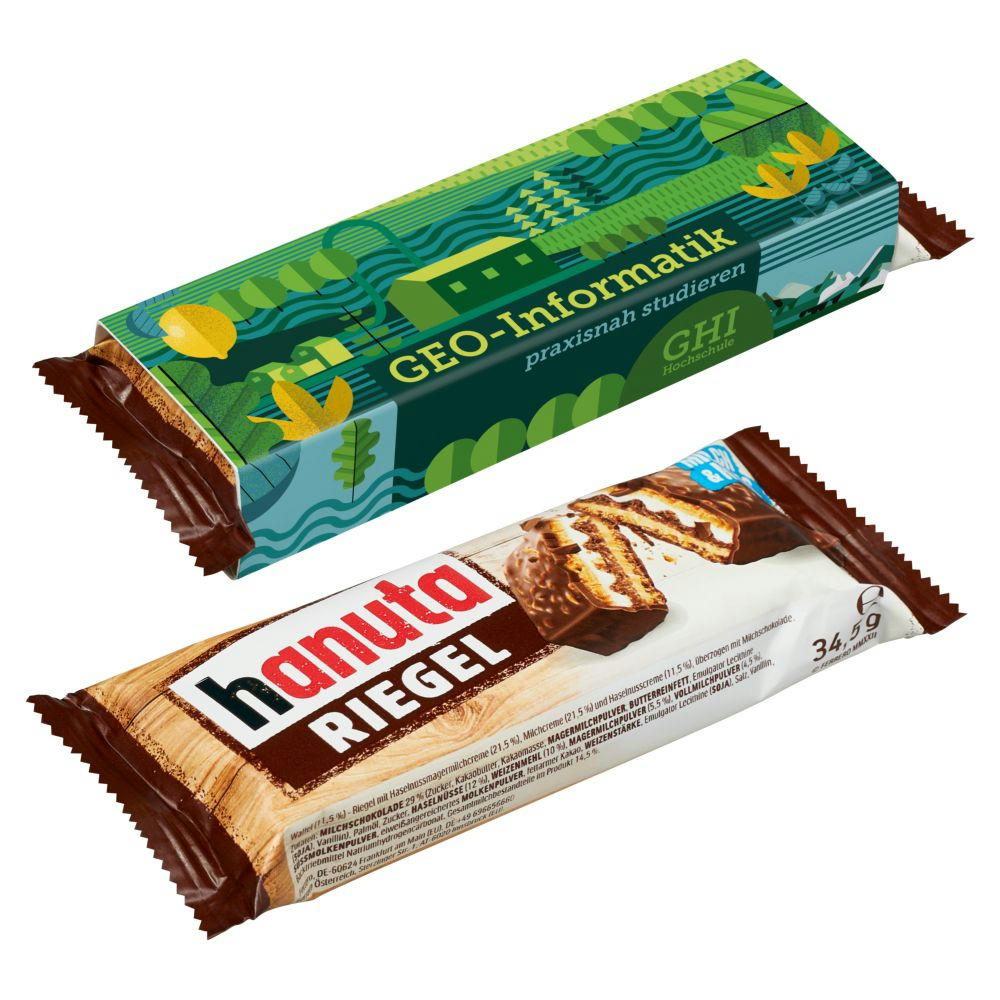 Mega knackig. Super knusprig. Lecker cremig. Locker schokoladig. Knusprig gebackene Waffeln, knackige Haselnüsse, feine Milchcreme und leckere Milchschokolade. Ideal als Messe- oder Meeting-Snack, für zwischendurch im Büro oder unterwegs. In handelsüblicher Ausführung mit Werbeschuber. Haltbarkeit: ca. 3 Monate bei sachgerechter Lagerung. Preis inkl. 4c Druck.