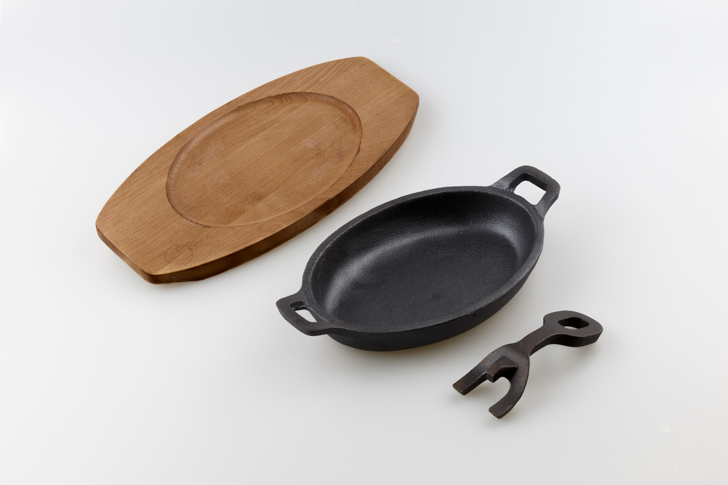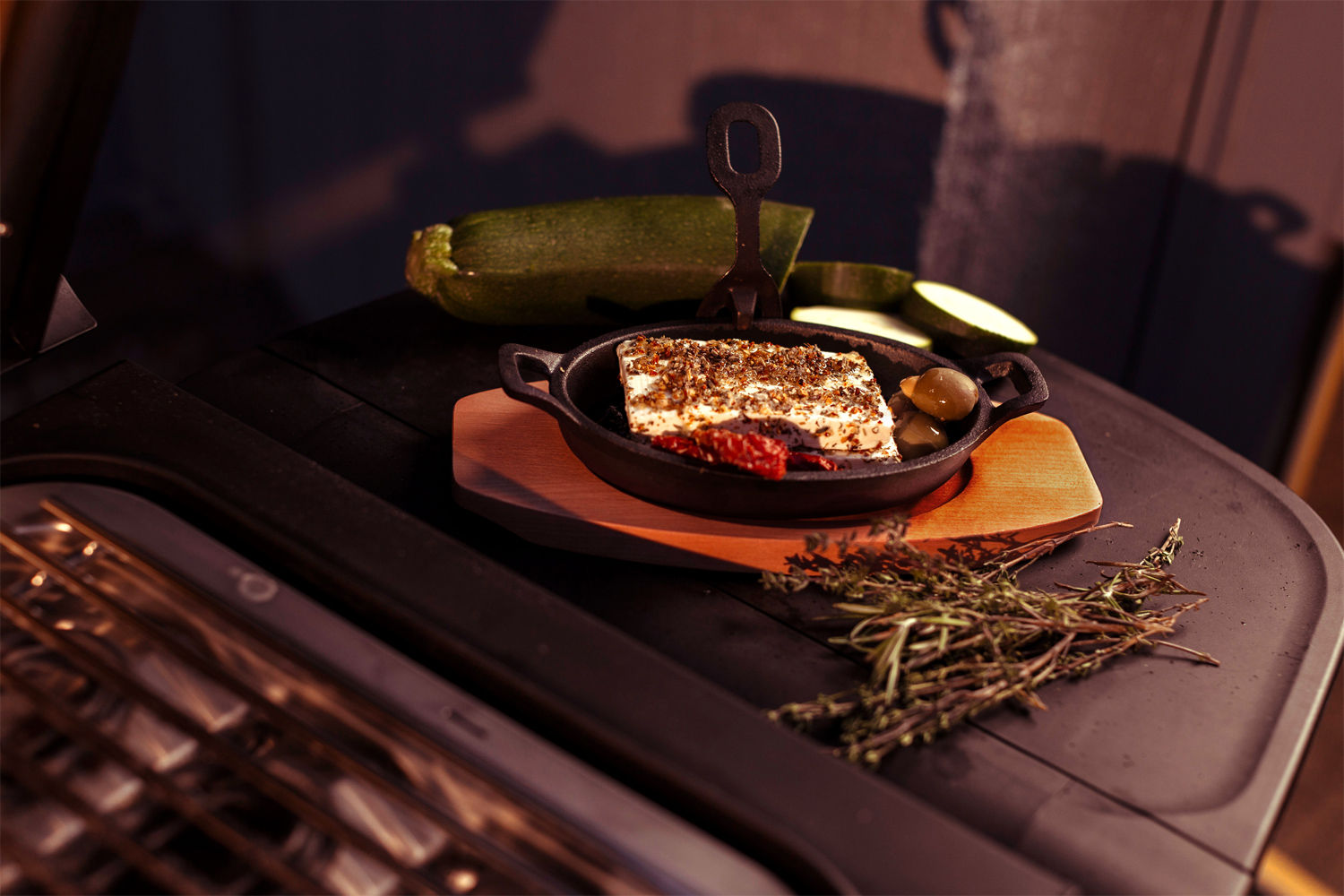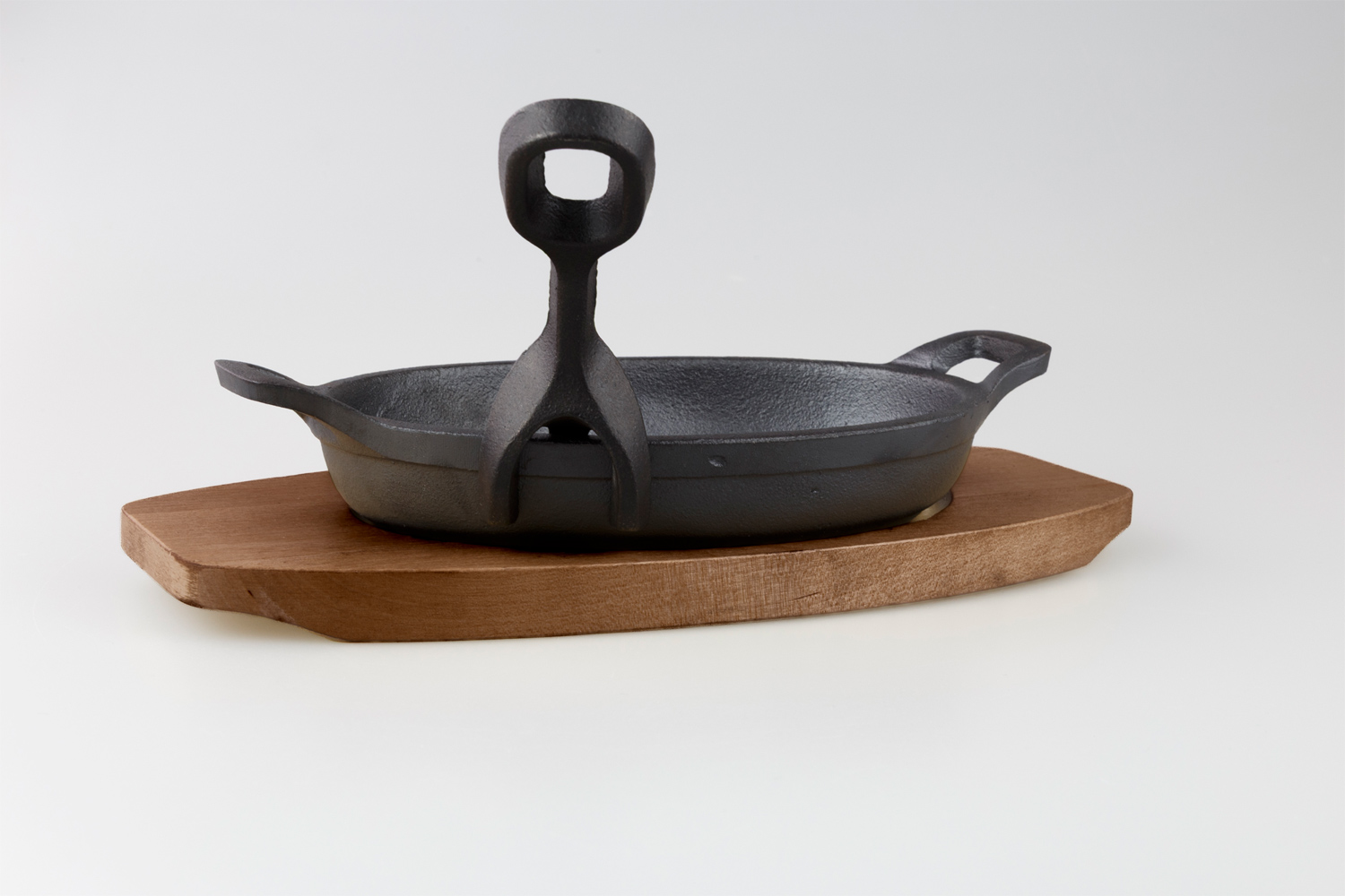 Rustikales Servierset mit gusseiserner Pfanne, abnehmbarem Griff und Akazienholzbrett. Ideal für Grill, Herd oder Ofen. Das Gusseisen garantiert gleichmäßiges Garen und hält Speisen lange warm.