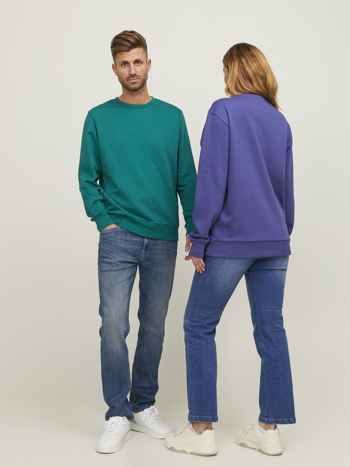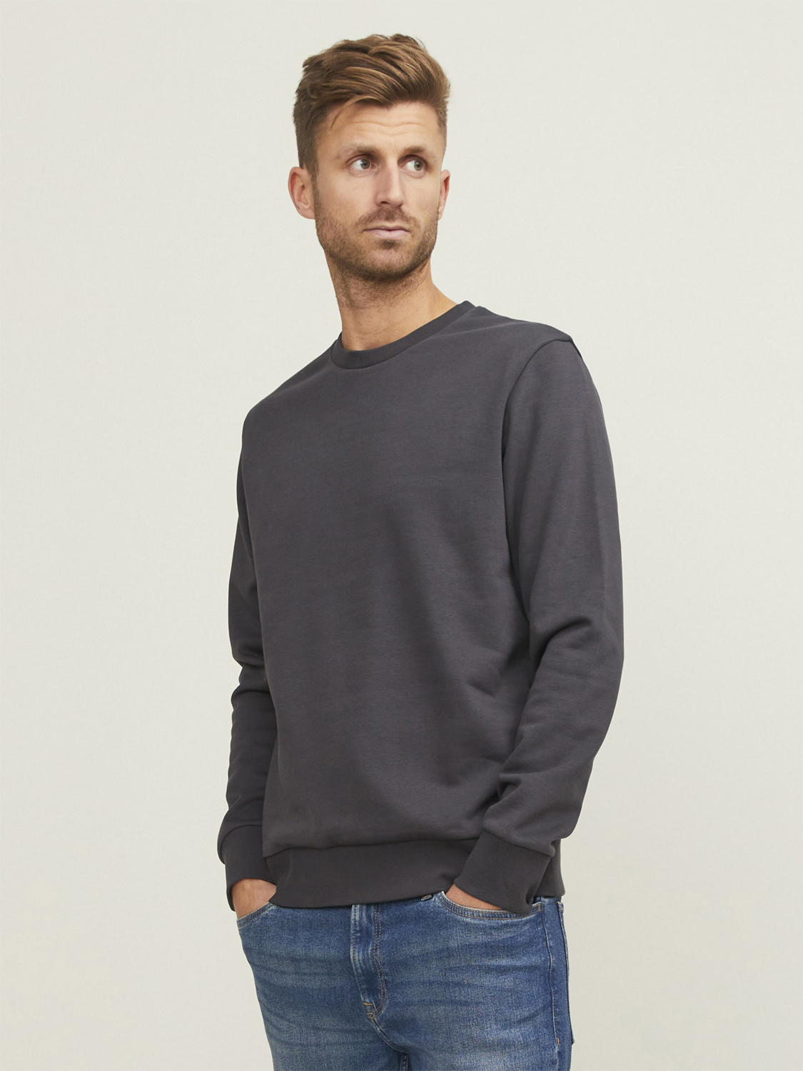 Klassischer Schnitt, breiter Rundhalsausschnitt, Halbmond im Nacken, Rippstrickbündchen an Ärmel und Saum, innen angeraut.