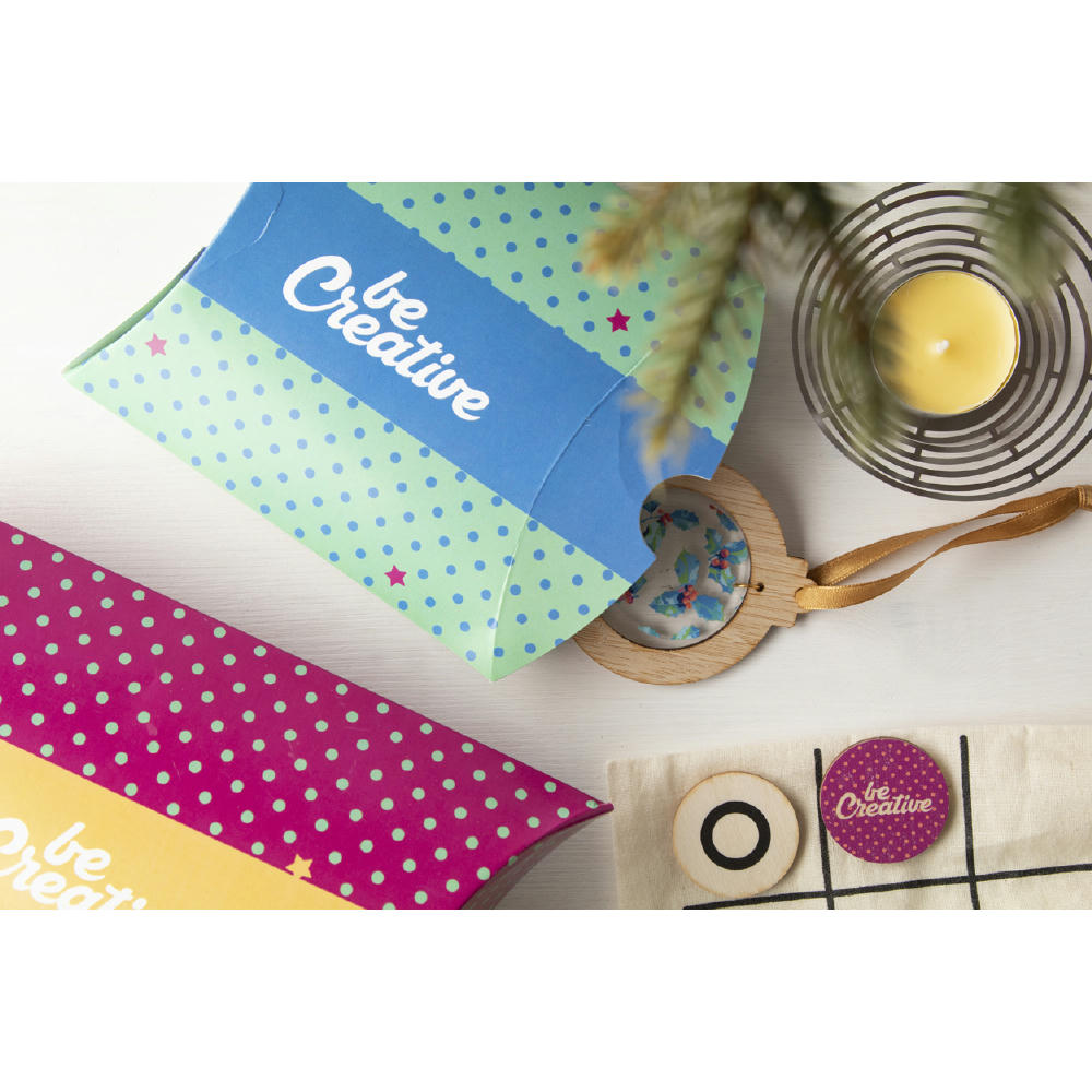 Individuelle Kissenverpackung aus Pappe mit vollfarbiger Bedruckung auf der Außenseite. Die Lieferung erfolgt flach verpackt. Preis inkl. vollflächigem 4c- Druck.