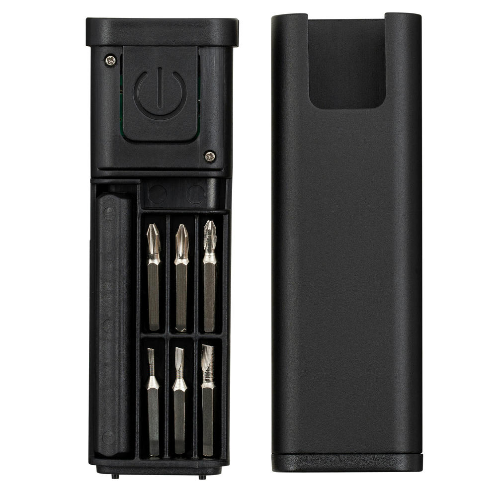 Die Leuchte ist 80 Lumen stark und über einen leicht bedienbaren An/Aus-Knopf zu steuern. Das rechteckige Kästchen aus eloxiertem Aluminium lässt sich aufschieben und enthält sechs Bits und einen Bithalter. Enthalten sind jeweils drei verschiedene Größen eines Kreuz- und Schlitzschrauben-Bits. Inkl. Gürtelclip.