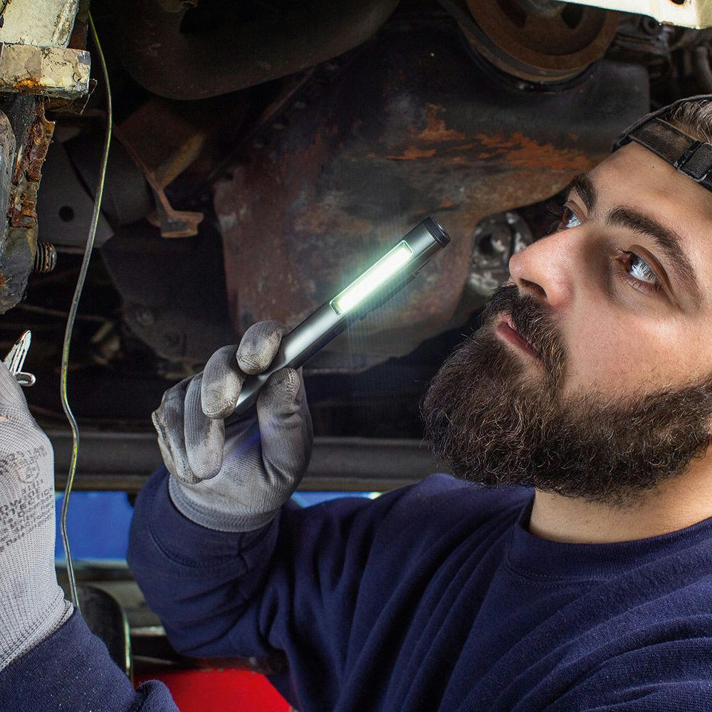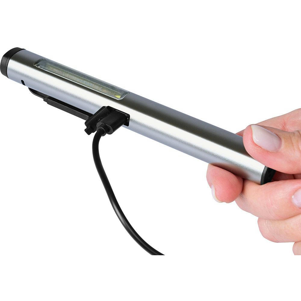 Gehäuse: Aluminium eloxiert. Leuchtmittel: Frontleuchte 5 W COB LED, Inspektionsleuchte 3 W LED, Laser 650 nm, UV-Licht 365 nm. Lichtwerte: Frontleuchte 450 Lumen, Inspektionsleuchte 140 Lumen. Ladezeit: ca. 3 Stunden. Leuchtdauer: ca. 2,5 Stunden (Frontleuchte 450 Lumen), ca. 2,5 Stunden (Inspektionsleuchte 140 Lumen), ca. 4 Stunden (UV-Licht). Leuchtmodi: Frontleuchte 100 % Power weißes Licht dimmbar, Inspektionsleuchte 100 % Power weißes Licht dimmbar, UV-Licht blau dimmbar, Laser rot. Equipment: 120° drehbarer Clip mit starkem Magnet, Ladekontroll-LED, USB (Typ A) / USB (Typ C) Ladekabel (50 cm Länge). Schutzklasse: IPX2. Stromversorgung: 3,7V 800mAh Li-Ionen Akku Typ 14500 (inkl.). Verpackung: schwarze Geschenkverpackung.