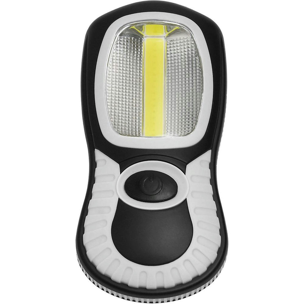 Arbeitsleuchte mit 3W COB LE D und 3 DIP LE D. Lichtwerte: Arbeitsleuchte 230 Lumen, Taschenleuchte 30 Lumen. Leuchtdauer: ca. 20 Std. Leuchtmodi: 100% Power weißes Licht. Starker vernickelter Magnet, 360° drehbarer Fixierhaken. Inkl. 3 AAA Batterien. In schwarzer Geschenkverpackung.