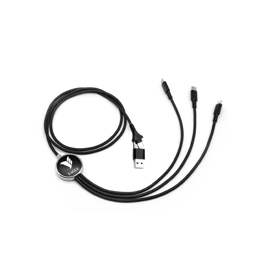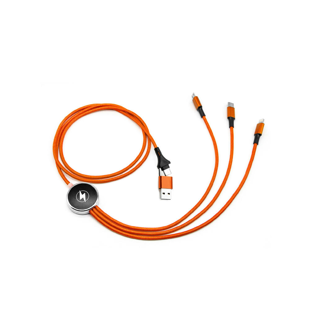 Multi-Ladekabel mit 5 Anschlüssen und LED-Logo. Ausgang: Micro-USB, iPhone- und USB-C-Anschluss. Eingang: USB-A und USB-C. Farbe LED: Weiß Ladefunktion mit 5V, 2A, kein Datentransfer. Kompatibel mit allen gängigen Geräten (ohne MFI-Lizenz). Verpackt in einem festen Polybeutel mit individueller Inlay-Card.