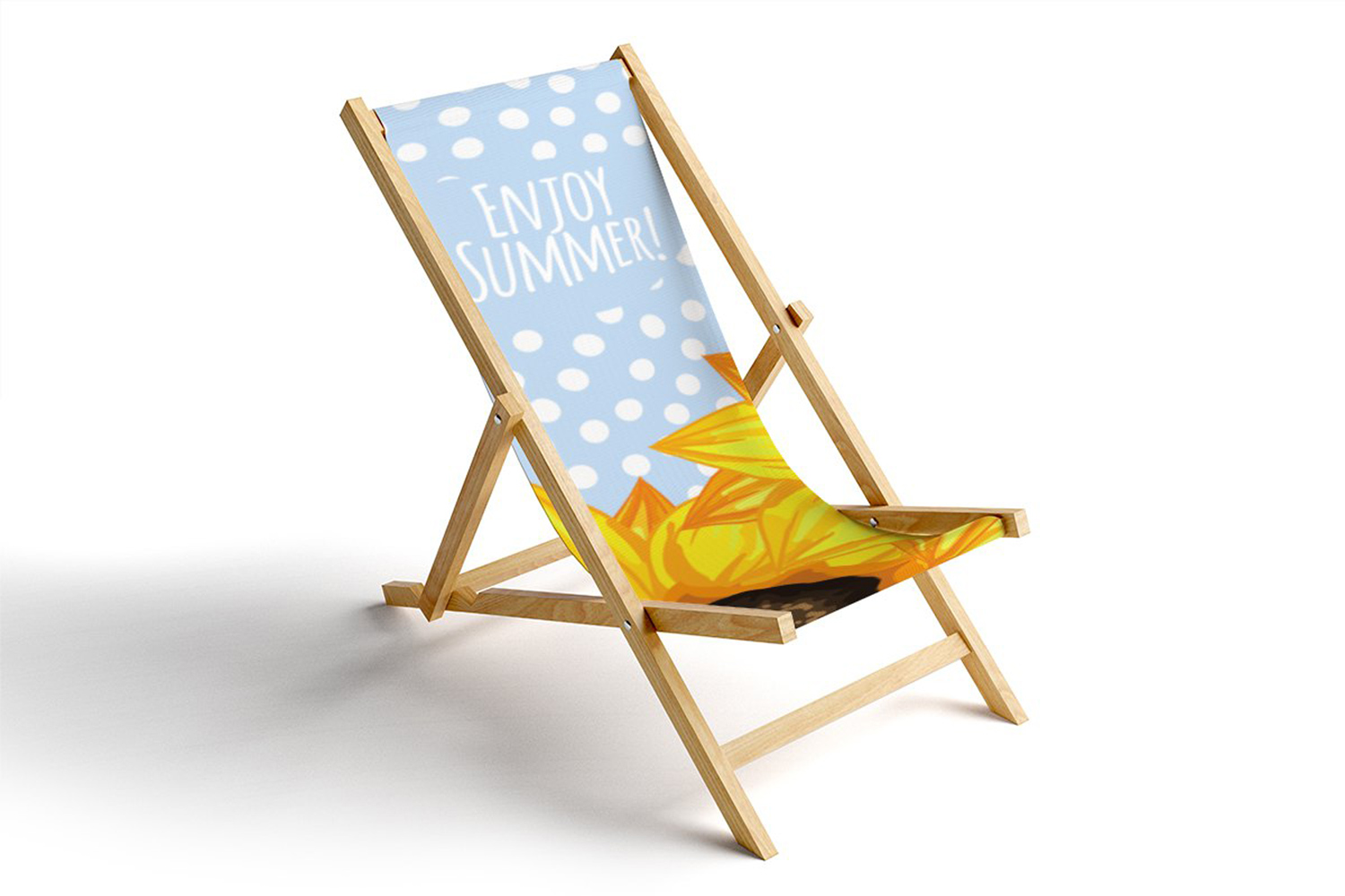 Bequeme und stylische Liegestühle, gestaltbar nach Ihrem Wunsch und individuellem Design. Gestell aus unbehandeltem Buchenholz, Liegebezug aus Polyester-Gewebe. Mit Kunststoffsicherung gegen ungewolltes Zusammenklappen. Einstellbar auf zwei verschiedene Sitz- bzw. Liegepositionen, TÜV und GS geprüft. Die kompakte Bauweise erlaubt ein platzsparendes Lagern. Werbeanbringung: vollflächiger Druck (Vorderseite Bezug, Rückseite bleibt weiß).