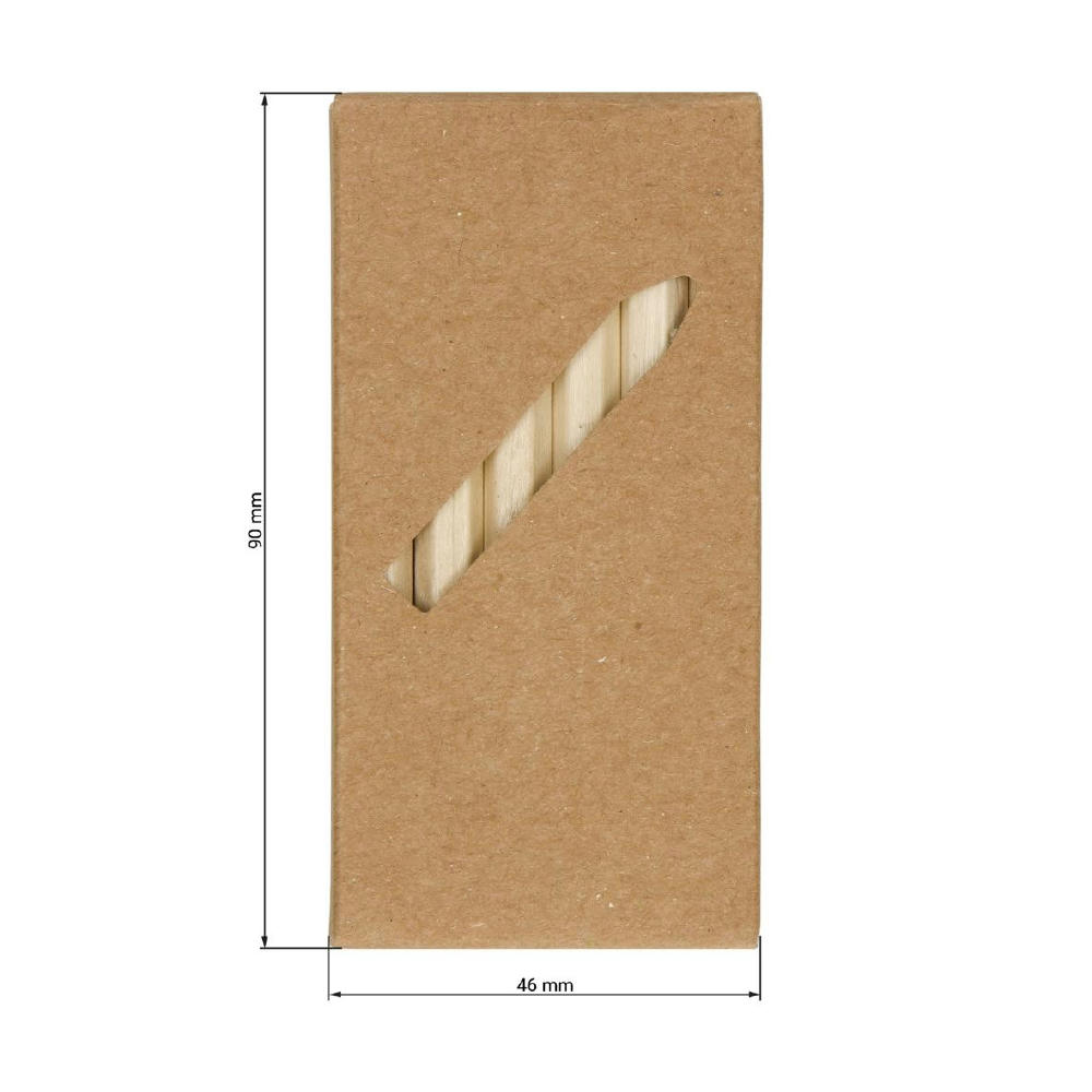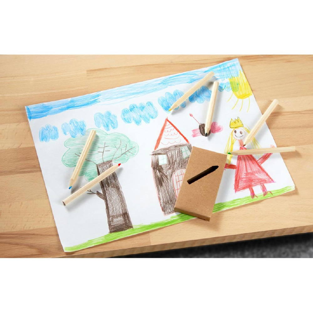 Kurze Malstifte aus unlackiertem Holz als 6er Set im Karton verpackt. Die Stifte sind sechseckig.