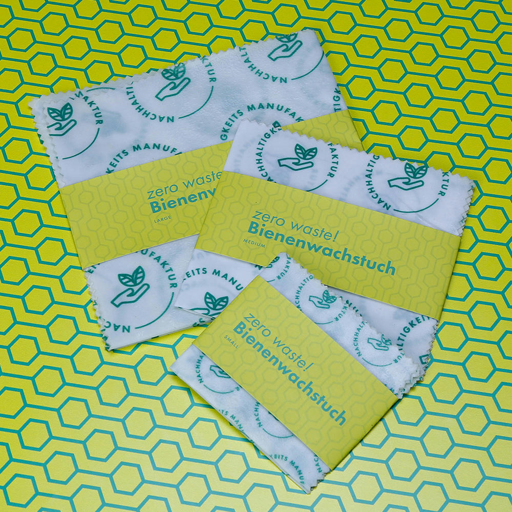 Ein praktisches Bienenwachstuch in Größe M – vollflächig mit Ihrem Logo als Streumuster bedruckt, kommt hier ganz kommunikativ in einer DIN lang Präsentationsmappe. Größe Tuch: 250 x 280 mm, Größe Mappe: 215 x 110 mm. Bedruckt, gefaltet und gesteckt; Tuch: 4-farbiger Streudruck (lebensmittelecht) aus Karton.