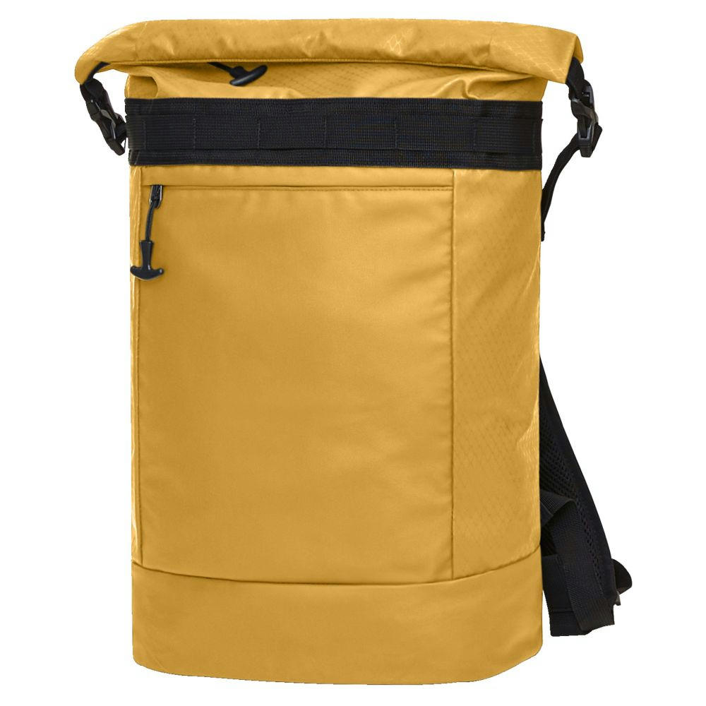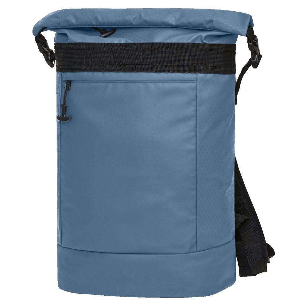 aufwändig gearbeiteter Rolltop-Rucksack; Reißverschluss-Hauptfach mit seitlichen Steckverschlüssen; gepolstertes Einsteckfach innen; große Reißverschluss-Vortasche; Funktions-Schaufenband auf der Front; rückseitig Befestigungsschlaufe für Trolley-Gestänge; verstecktes Reißverschluss-Fach; gepolstertes Tragesystem mit höhenverstellbarem Brustgurt; sowohl seitlicher als auch rückseitiger Handgriff