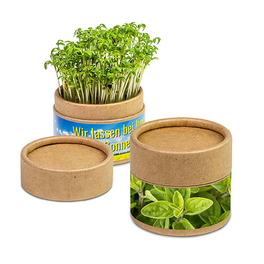 Aus Kraftpapier produziert und mit Wachs versiegelt, ist der Pflanz-Cup ein Highlight im Bereich „werben&wachsen“. Im runden Behältnis werden mit einer Substrattablette als Erde, Samen nach Wahl und Wasser schöne Pflänzchen für Fenstersims oder Bürotisch herangezogen. Die umlaufende Banderole kann individuell bedruckt werden. Verschlossen wird dieses kreative Produkt mit einem Deckel, ebenfalls aus Kraftpapier.