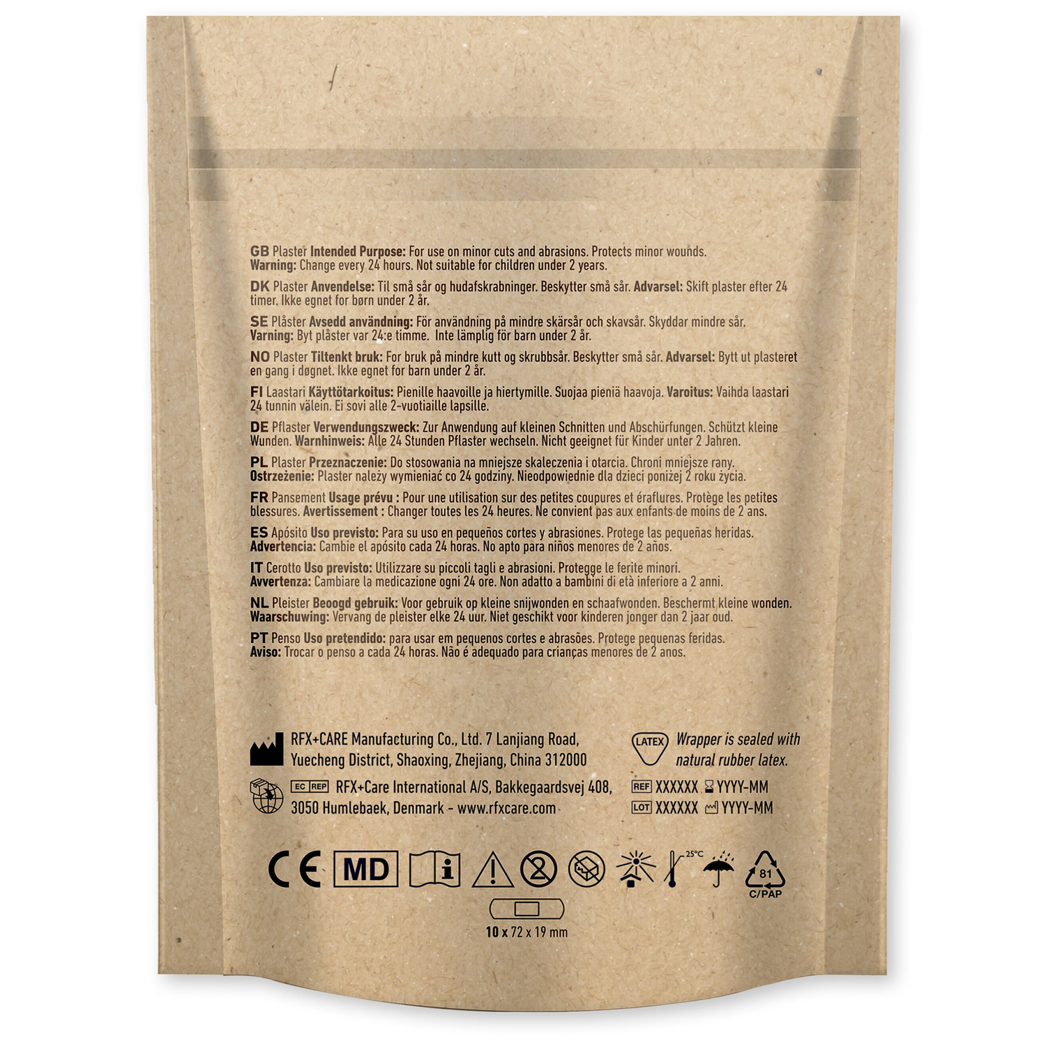 10 Stück individuell gestaltbare Pflaster mit bedruckter Papiertasche. Dieses Produkt erfüllt die strengen Anforderungen der Medizinprodukteverordnung (MDR) und ist bei der FDA in mehreren Ländern registriert. Entspricht den Normen ISO14001:2015 und ISO9001:2015. Pflastergröße: 72x19 mm. Vollfarbiger Digitaldruck auf der Verpackung möglich.