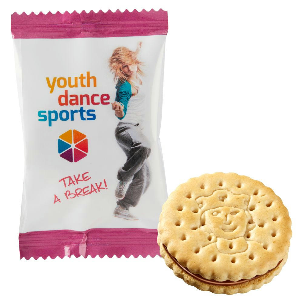 Doppelkeks mit Kakaocremefüllung (35 %) in glänzend- oder matt-kaschiertem transparentem alternativ weißem Flowpack einzeln verpackt. Bruch einzelner Kekse möglich. Inhalt: 1 Stück à ca. 7,6 g. Haltbarkeit: ca. 9 Monate.