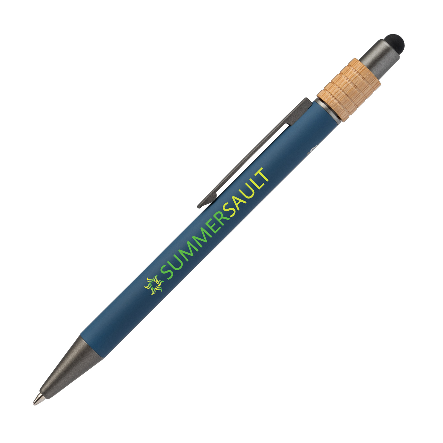 Kugelschreiber aus recyceltem Aluminium mit einer Gummibeschichtung, die aus robustem RABS-Material gefertigt ist. Der Kolben besteht aus Bambus, der aus verantwortungsvoller Forstwirtschaft stammt, und dreht sich leichtgängig auf Kugellagern. Mit Hochleistungs-Tintenpatrone, Schreiblänge 1.800 Meter. Der Schaft ist mit einem lasergravierten Symbol für recycelte Materialien verziert, gegenüber vom Clip. Inkl. 4c-Druck.