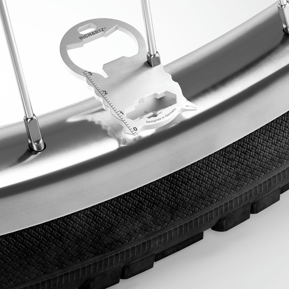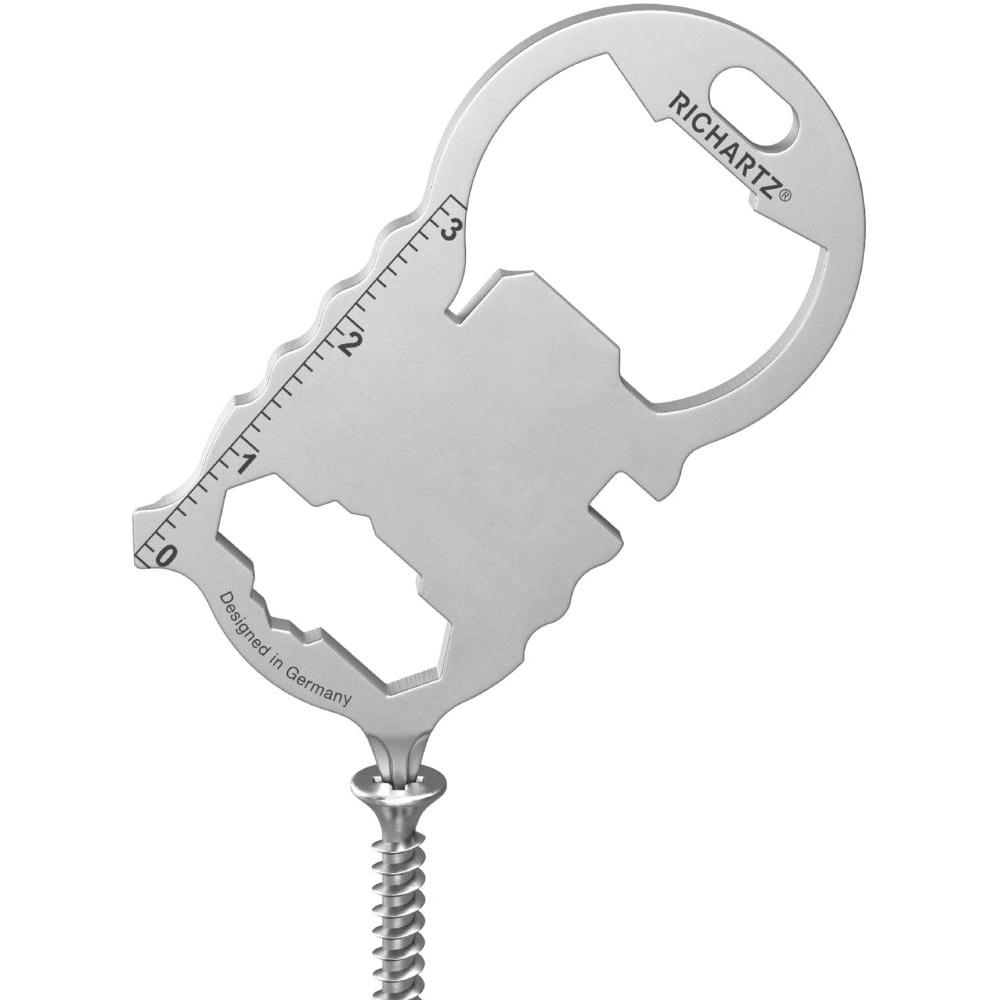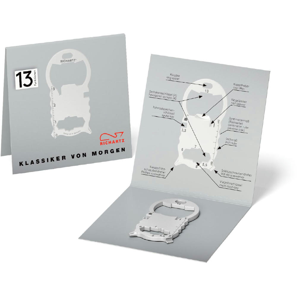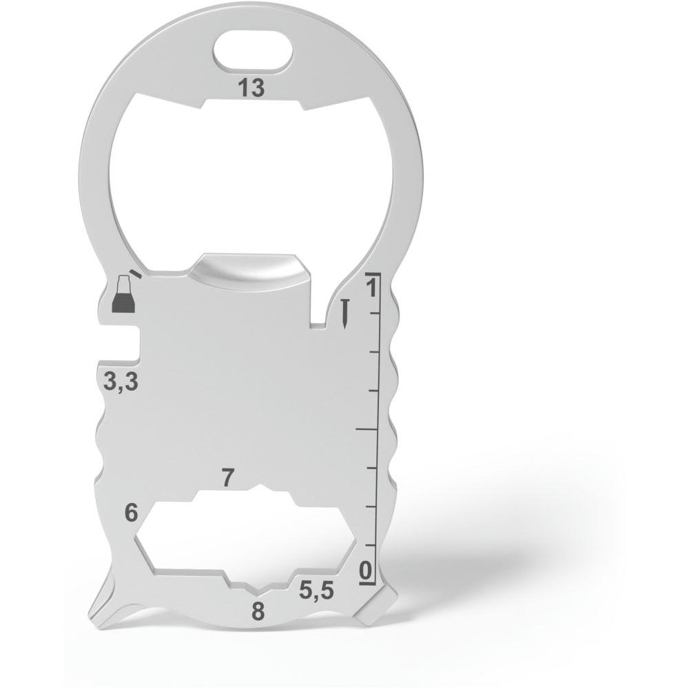 Kleines, kompaktes Multitool mit 13 Funktionen, aus hochwertigem, matt gestrahltem Edelstahl gefertigt. Passt an jeden Schlüsselbund. Inkl. Lasergravur und individuell gestalteter Verpackung.
