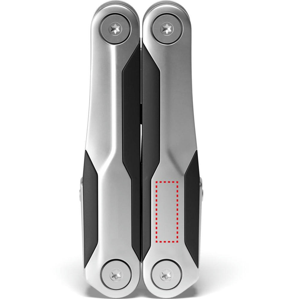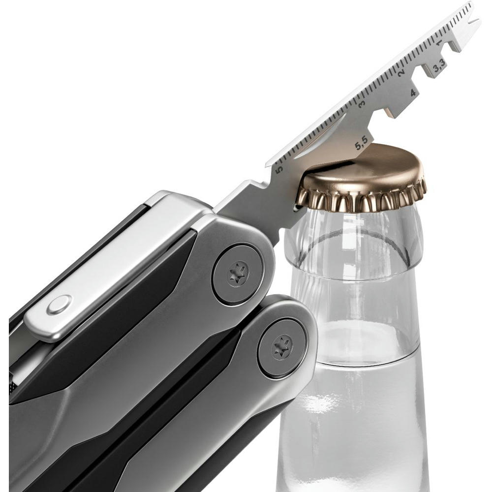 Edelstahlgriffe matt gestrahlt im Materialmix mit Kunststoff-Griffzonen. Funktionen: Gegossene Zange, Drahtschneider, Glasbrecher, Bit-Satz mit 9 Bits, große Klinge, Säge, Feile, Kapselheber, Kreuzschlitzschraubendreher, Schlitzschraubendreher, großer Schlitzschraubendreher, Sechskantschlüssel, Fahrradspeichenschlüssel (2), Kabelabzieher, Nagelzieher, Zentimetermaß, Inchmaß.