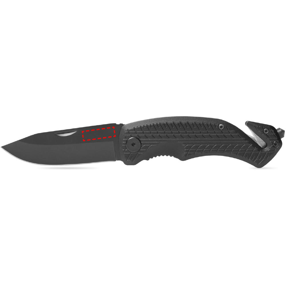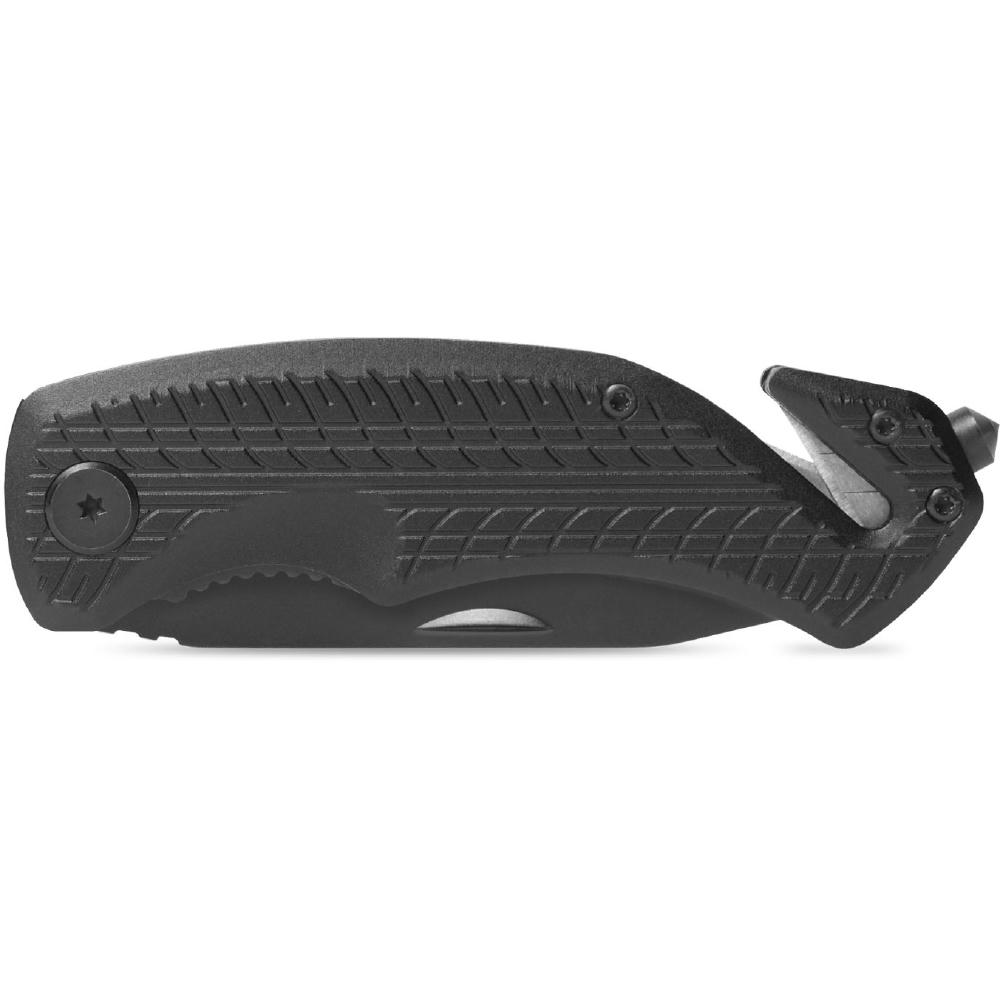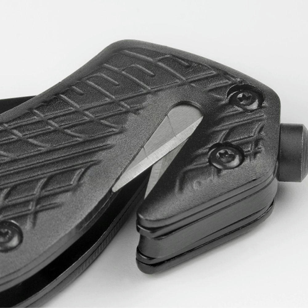 Das schwarz beschichtete Tool mit kräftiger, rostfreier Klinge und Safety-Lock Klingenverriegelung gibt Sicherheit im täglichen Gebrauch. Der GurtSCHNEIDER mit doppelter Klingenführung garantiert den schnellen Schnitt. Der speziell gehärtete Werkzeugstahl des Glasbrechers ermöglicht das präzise Zerschlagen der Glasscheibe. Mit geprägter Reifenstruktur auf dem Griff und schwarz beschichteter Klinge.