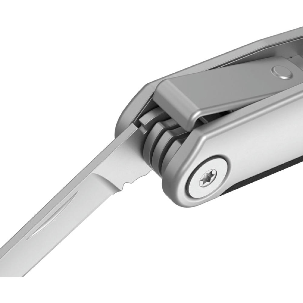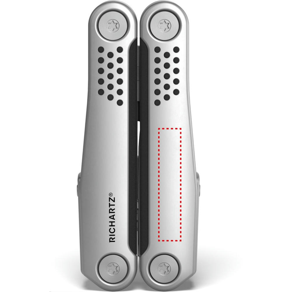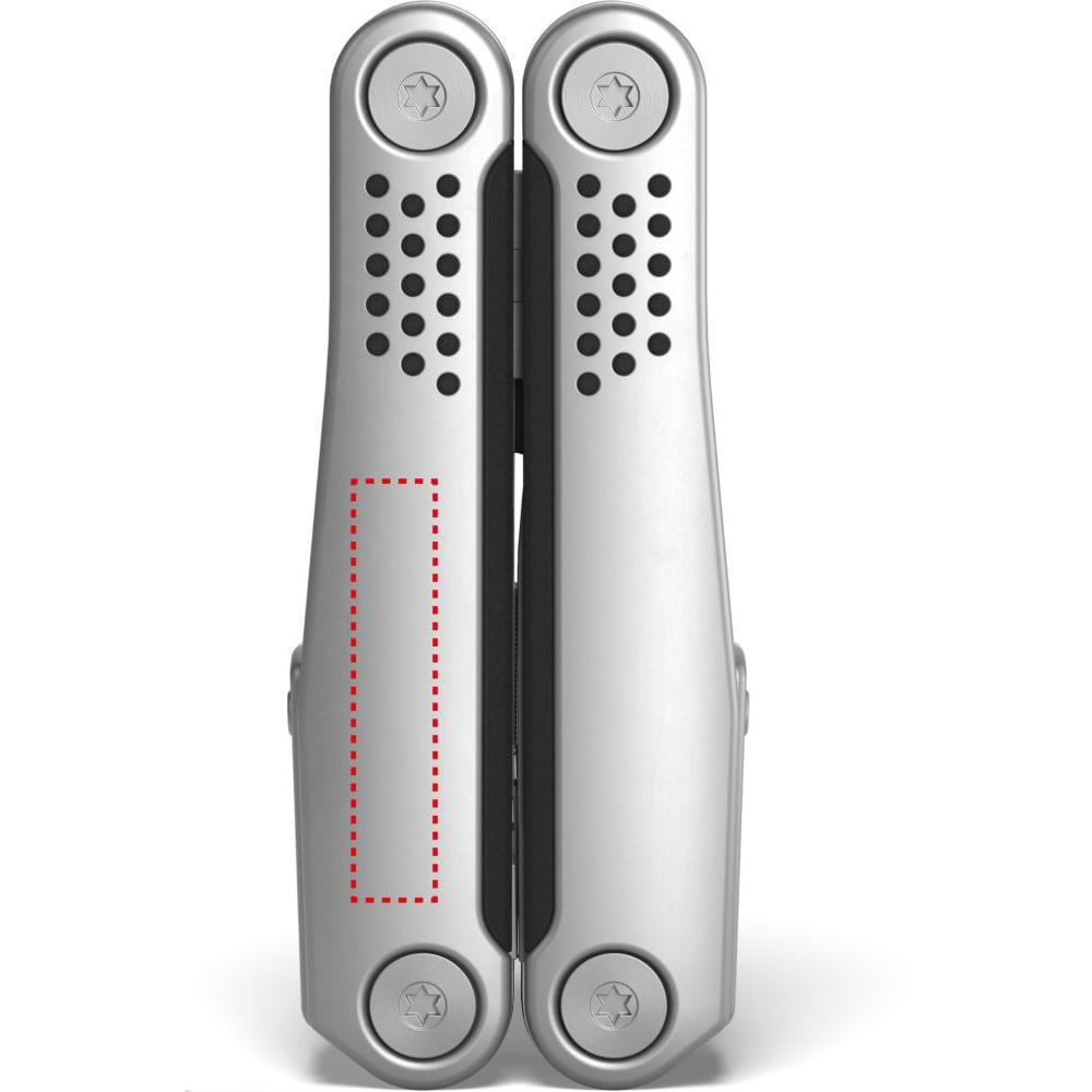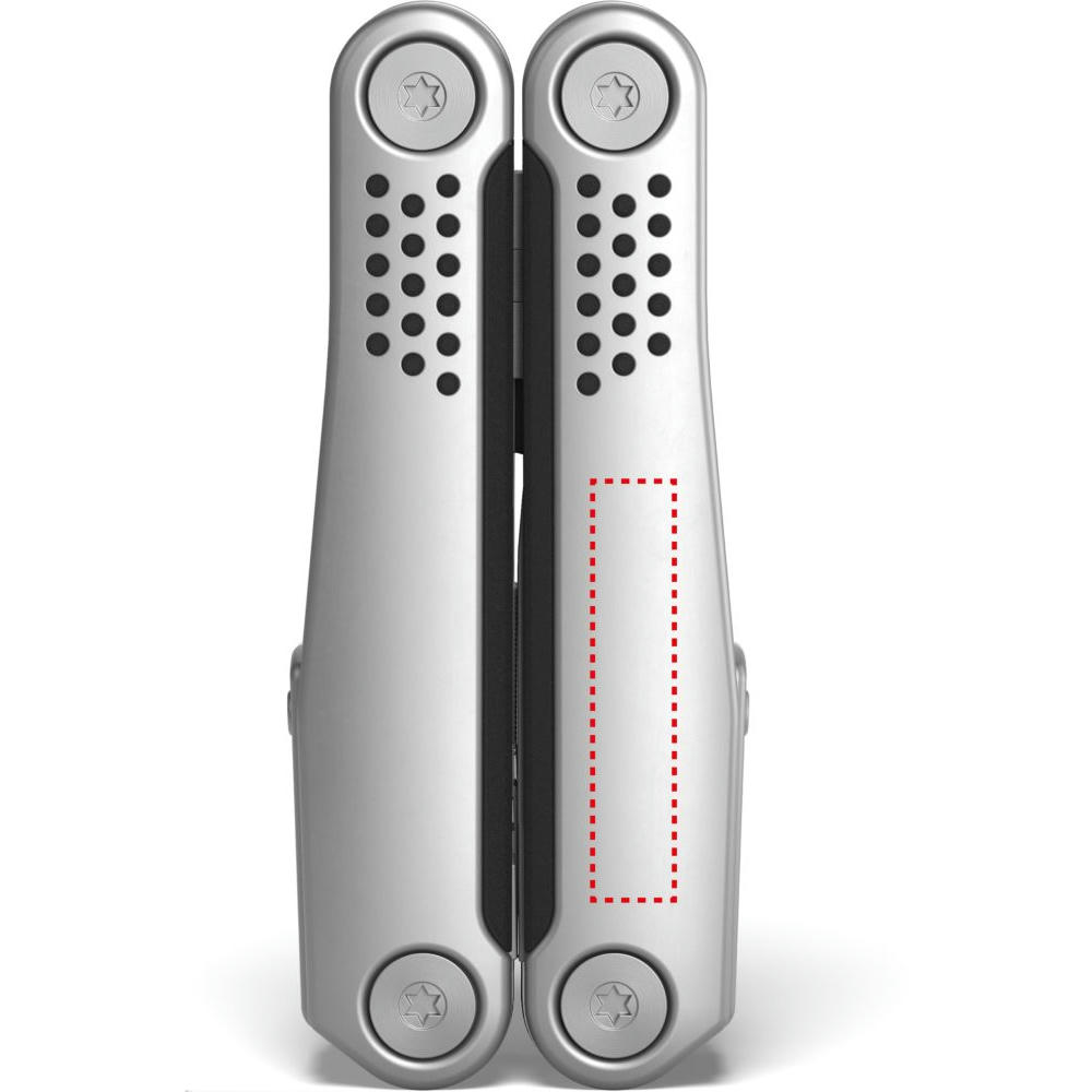 Alle ausklappbaren Funktionsteile sind einfach zu arretieren. Funktionen: Gegossene Zange, Drahtschneider, Schere, Glasbrecher, Bit-Satz mit 9 Bits, große Klinge, Säge, Kapselheber, Kreuzschlitzschraubendreher, Schlitzschraubendreher, Sechskantschlüssel, Fahrradspeichenschlüssel (2), Kabelabzieher, Nagelzieher, Zentimetermaß, Inchmaß. Ab 100 St. individuelle Gestaltung der Verpackung und Lasergravur auf dem Tool gegen Aufpreis möglich.