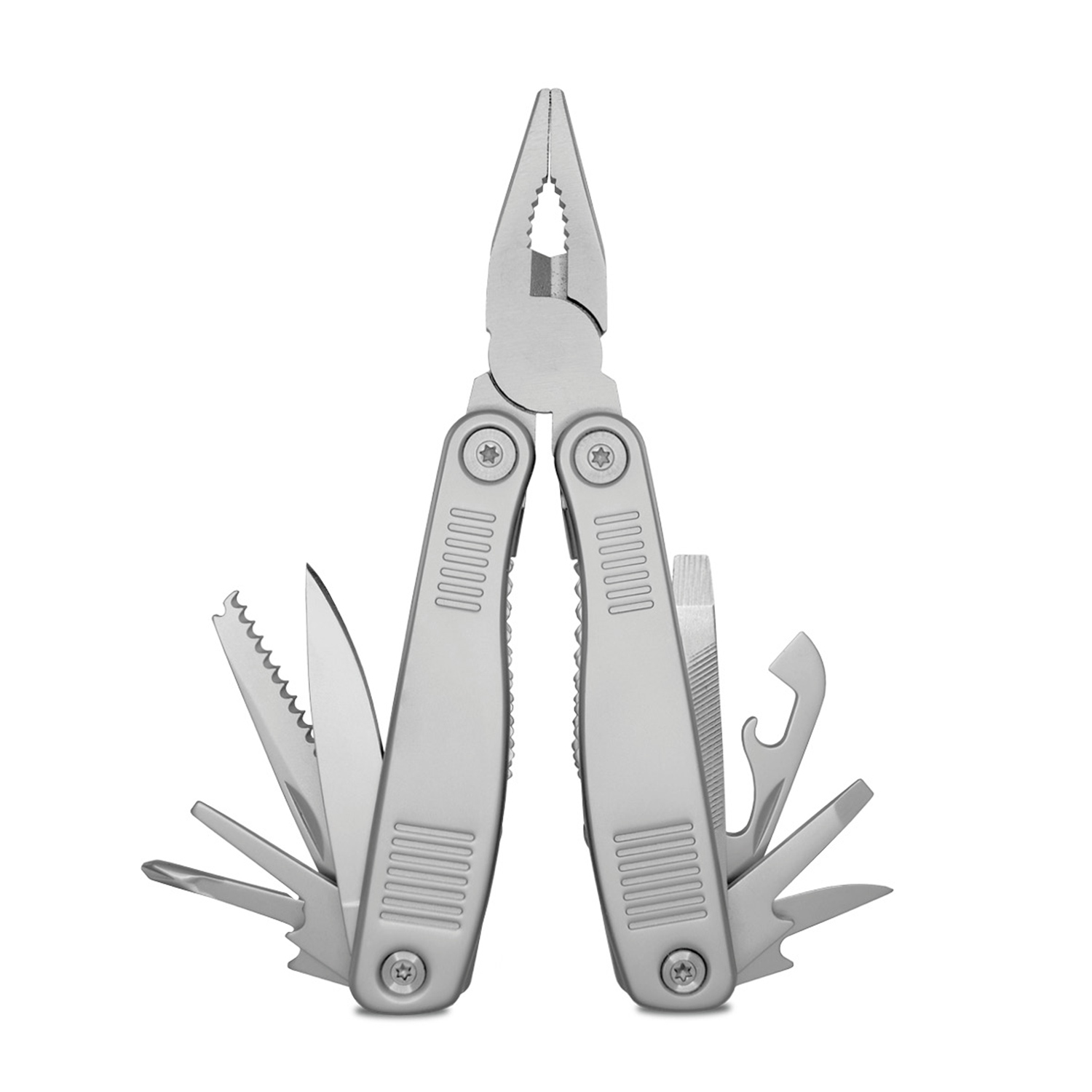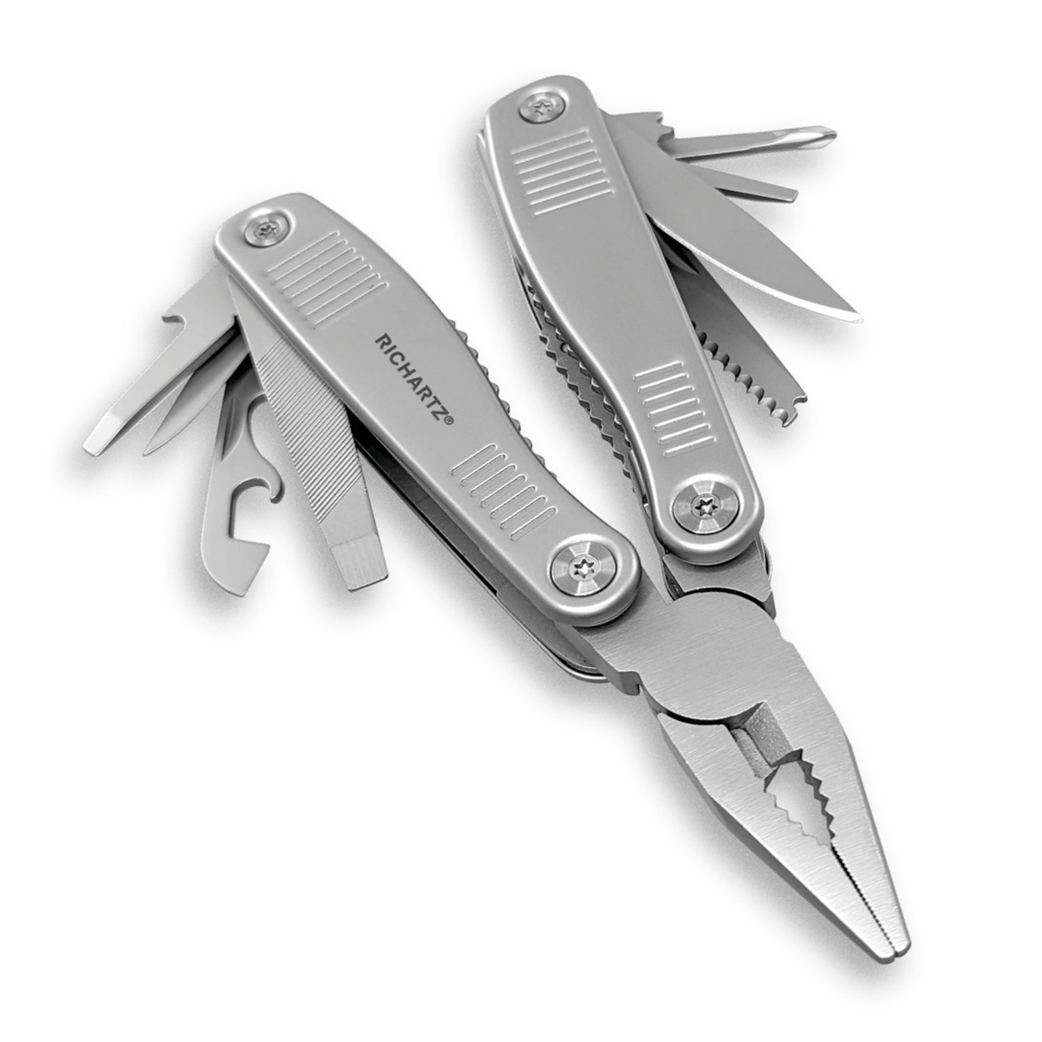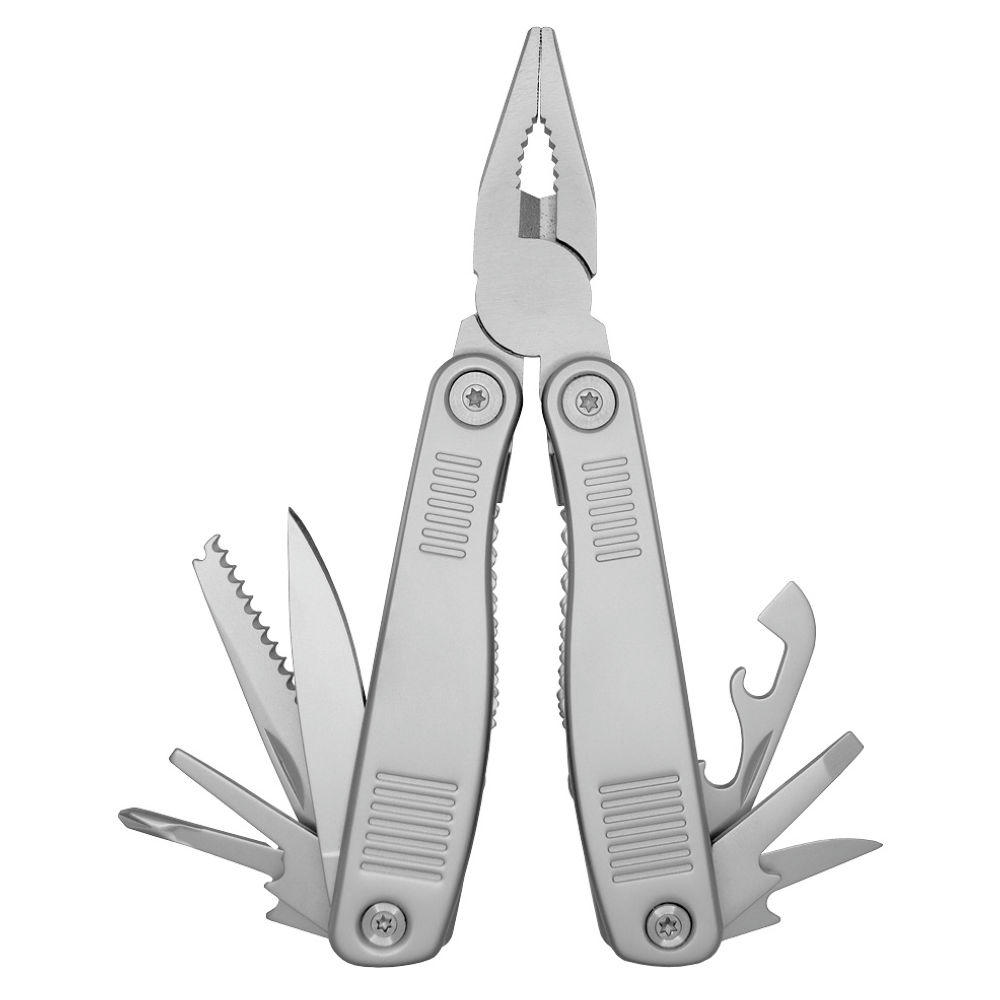 Mit vielen nützlichen Funktionen für jede Gelegenheit ist das Multitool der perfekte Helfer in jeder Situation. Und für ein hohes Maß an Arbeitssicherheit lassen sich alle ausklappbaren Funktionsteile arretieren. Gut zu wissen, dass man es hat! Funktionen: 1. Gegossene Zange, 2. DrahtSCHNEIDER, 3. Feile, 4. Schlitzschraubendreher (3), 5. Dosenöffner, 6. Kapselheber, 7. Kleine Klinge, 8. Säge, 9. große Klinge, 10. Kreuzschlitzschraubendreher, 11. Gürteltasche