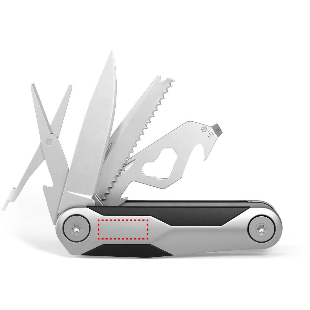 Kompaktes Taschenmesser mit 10 Funktionen: Klinge, Säge, Kapselheber, Schere, Schlitzschraubendreher, Sechskantschlüssel (3), Brief- und Paketöffner, Profiltiefenmesser.