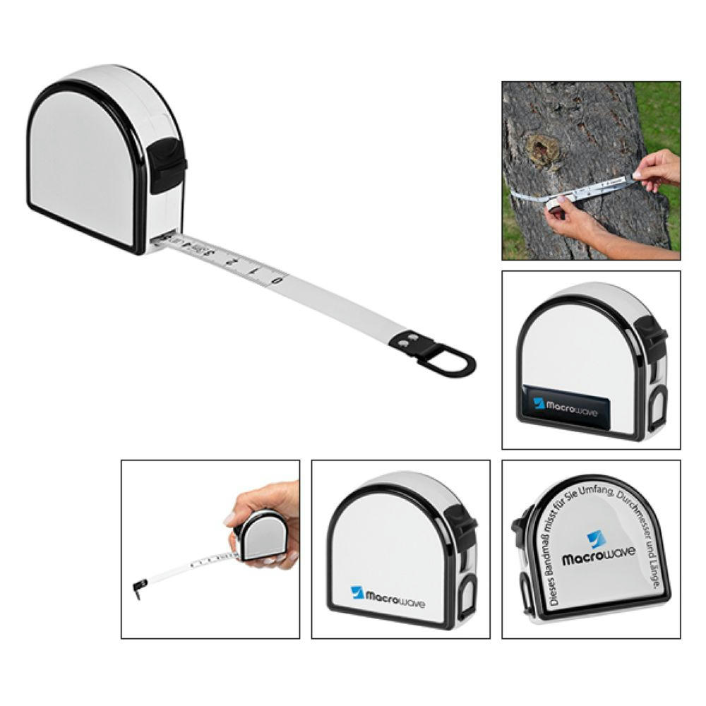 Bandmaß mit Durchmesserskala. Schlagfestes Gehäuse. Mit dyn. Bandrücklauf. Band: 3 m/13 mm, lackiert. Skalierung: cm, zweiseitig (Länge/Umfang, Durchmesser). Genauigkeit: EG -Klasse II . In schwarzer Geschenkverpackung.