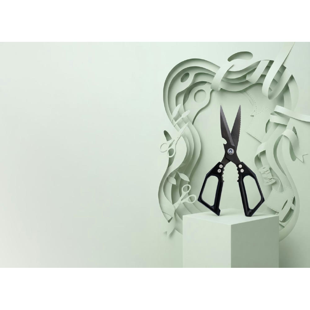 Schneidet, knackt, öffnet, schuppt und vieles mehr. - Universalschere aus brüniertem SK5- Stahl, - Härtegrad ca.60-65 Rockwell. - Maße (BxHxT): 231 x 91 x 15 mm, - Klingenlänge 92 mm. - Gewicht: 209 g. - - Werbeanbringung: - Auf der Schneide, 35 x 5 mm (L2); - - Dieses Produkt unterstützt aktiv den Ausgleich der - entstehenden CO2-Emissionen durch zertifizierte - Klimaschutzprojekte.