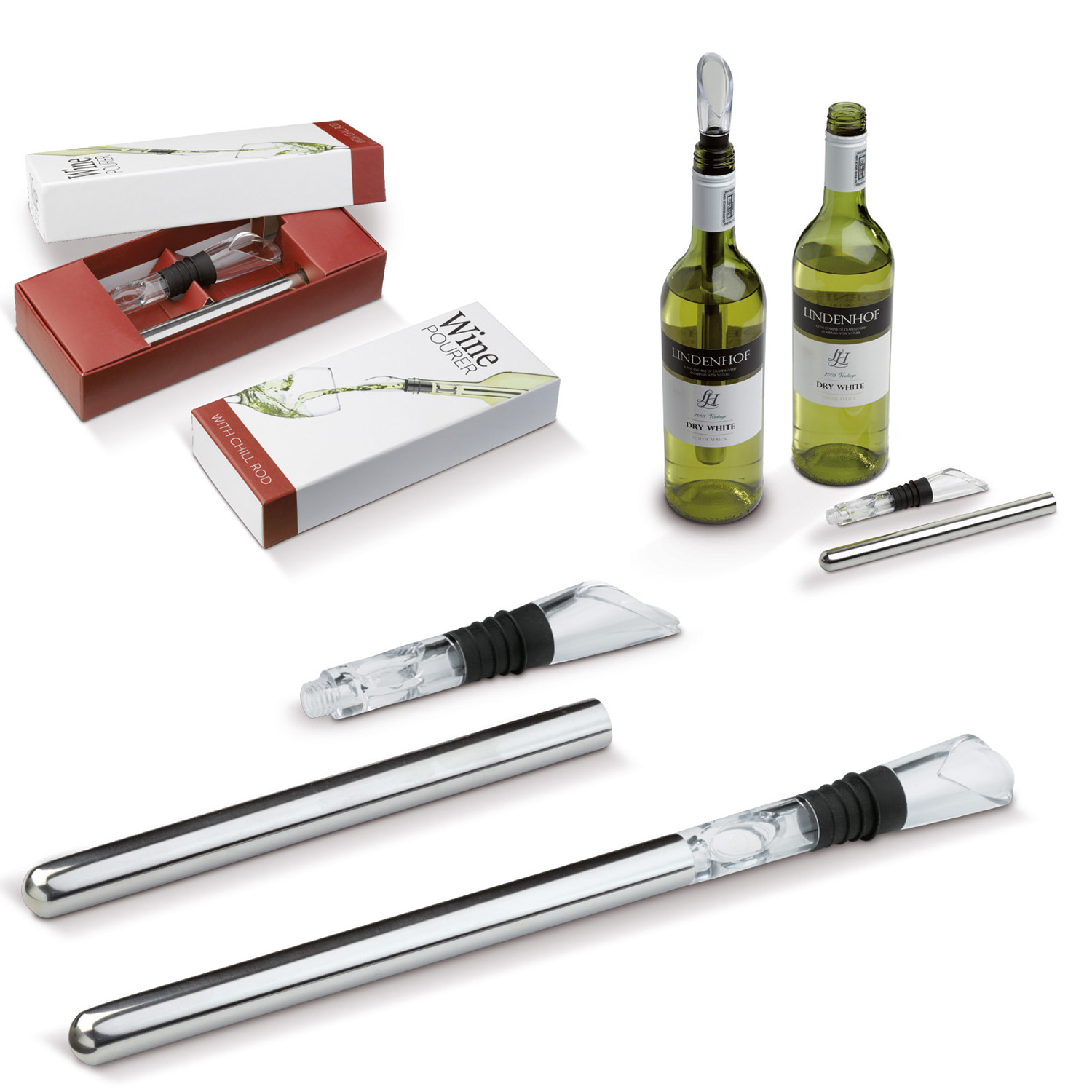 Dieser innovative Weinkühler bringt Ihren Wein schnell auf die gewünschte Temperatur. Der Kühlstick wird einfach für ca. 30 Minuten in den Gefrierschrank gelegt und danach zusammen mit dem Ausgießer in Ihre Weinflasche eingehängt. Innerhalb kürzester Zeit ist Ihr Wein wohltemperiert und bleibt über Stunden kühl. * Nach Gebrauch einfach unter warmem Wasser abspülen. * Abtrocknen und zurück ins Gefrierfach für den nächsten Einsatz. * Verpackt in einer schönen Geschenkbox. * Preis ab 100 Stück
