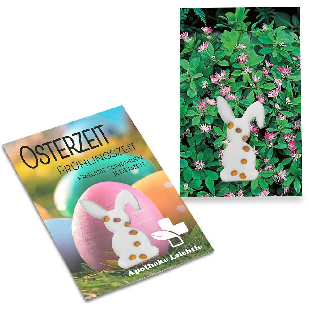 Der Hase lässt die Ohren hängen, doch die Werbewirkung ist stark. Dieser sympathische Werbe- und Mailingartikel vermittelt auf Anhieb, worum es geht: Ein Sichtfenster in Hasenform greift das Oster-Thema auf und zeigt die Pflanzensamen – entweder die Samen des Eierbaumes oder wahlweise weitere Samensorten. Diese bewegen sich locker im Tütchen und wecken die Lust aufs Gärtnern. Die Karte im praktischen Scheckkartenformat lässt sich beidseitig individuell gestalten – der perfekte Werbeträger für die Frühlingssaison.