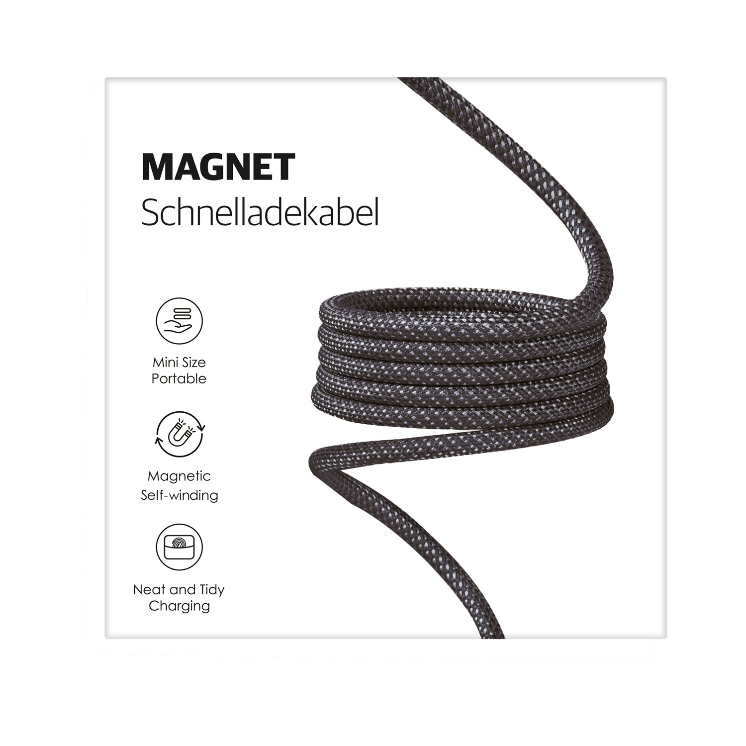 Dieses magnetische Ladekabel mit textiler Ummantelung bietet eine praktische Aufrollfunktion. Es ist mit einem Type-C auf Type-C Anschluss und einem Apple-Lightning Adapter ausgestattet. Dieses Produkt ist patentiert.