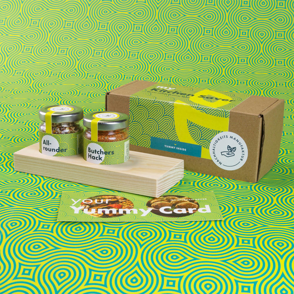 Hochwertiges Servierset bestehend aus einem naturbelassenem Massivholzbrett mit dezenten Einlassungen für zwei #mini Gewürz-Gläser: 1 x Allrounder und 1 x Butchers Hack. Alle Etiketten in Ihrem Corporate Design inklusive. Mit Ihrem Logo als Lasergravur auf dem Holzbrett, individuellem Label auf der Geschenkbox und innen liegender „Yummy Card“ mit tollen Rezeptideen entsteht ein unverwechselbares Werbegeschenk! Gegen Aufpreis auch mit ReUse Deckel Ausstattung!