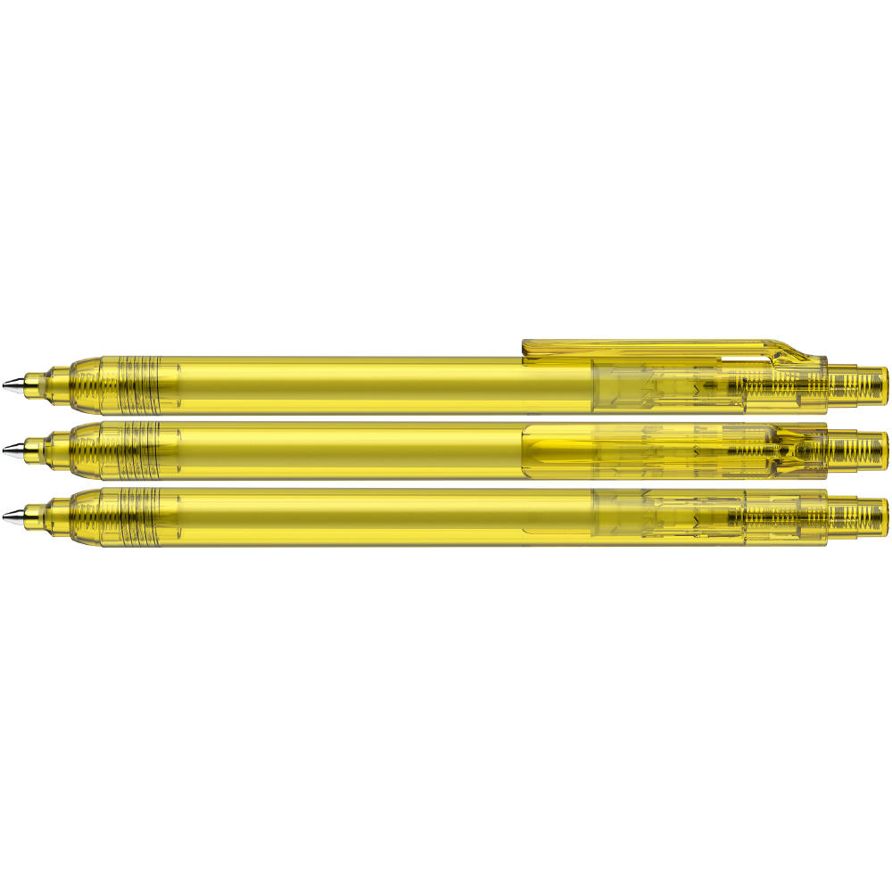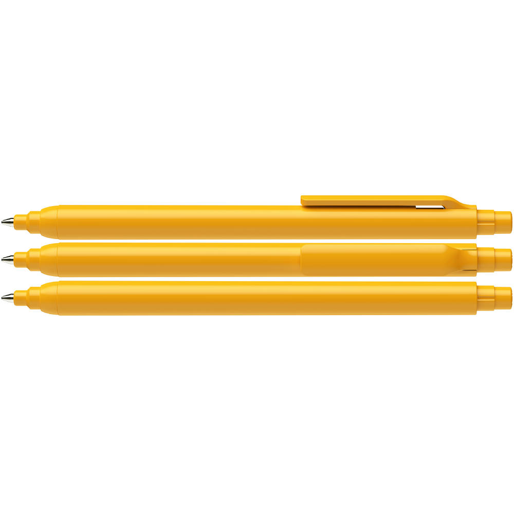 Druckkugelschreiber aus transparentem oder opakem Kunststoff mit glänzender Oberfläche. Abgestufter Drücker und Spitze. Ausgestattet mit Schneider-Mine 774 M. Produkt mit finanziellem Klimabeitrag: Kompensation in Höhe der unvermeidbaren Emissionen in ein zertifiziertes Klimaschutzprojekt. Gehäuse: gelb. Schreibfarbe: blau.