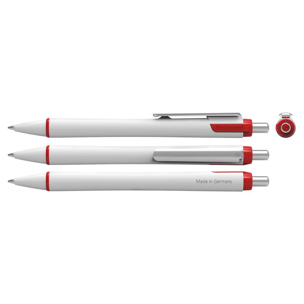 Druckkugelschreiber mit weißem *Gehäuse aus 70 % biobasiertem Kunststoff. Die Viscoglide®-Technologie sorgt für außergewöhnlich weiches und gleitendes Schreiben. Leicht konkav geformter Schaft und stabiler Metallclip. Zierring und Schaftverlängerung farblich abgesetzt. Ausgestattet mit Schneider-Mine 778 XB. Produkt mit finanziellem Klimabeitrag: Kompensation in Höhe der unvermeidbaren Emissionen in ein zertifiziertes Klimaschutzprojekt. Gehäuse: weiß/schwarz. Schreibfarbe: schwarz.