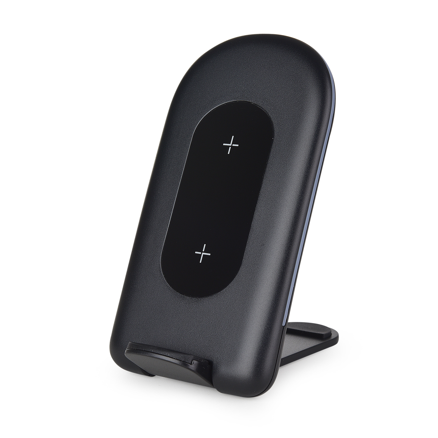 Faltbarer Handy Ständer. Kabellos im Hoch- oder Querformat laden. Bis zu 15 Watt Fastcharge mit 2 Ladezonen für kleine und große Smartphones. Anschlusskabel USB auf USB-C. Verpackt im Displaykarton.