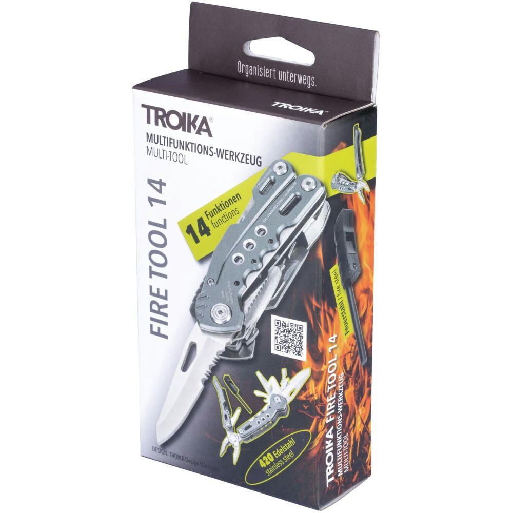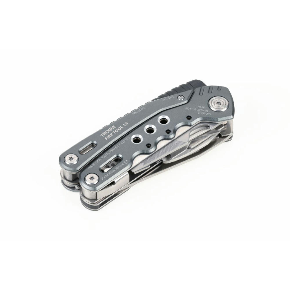 Multifunktions-Werkzeug mit 14 Funktionen, integrierte Feder und Feststellfunktion, Spitzzange, Zange, SeitenSCHNEIDER, Messer, Säge, Schere, Paketmesser, Schlitzschraubendreher in 2 Größen, Flaschenöffner, Kreuzschraubendreher, Feile, Feuerstahl, Pfeife. In Nylontasche mit Gürtelschlaufe.