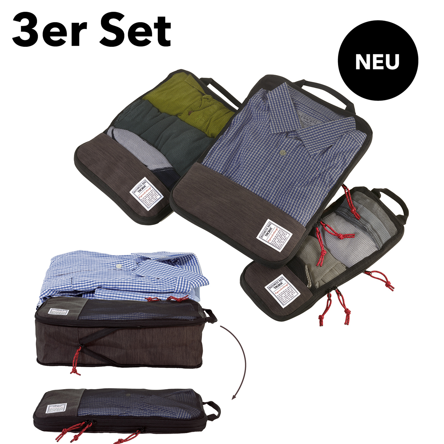 Kompressionstaschen-Set: 3 Packtaschen mit Reißverschluss und zusätzlichem Kompressionsreißverschluss für platzsparendes, geordnetes und knitterfreies Packen von Kleidung in Koffer & Rucksack, 3 Größen: L (Hemden & Hosen), M (Shirts), S (Wäsche & Socken), jeweils mit Netzfenster und Tragegriff. Material: Polyester. Farben: anthrazit, schwarz. Maße: 39 x 27 x 4 x cm, Gewicht: 445 g