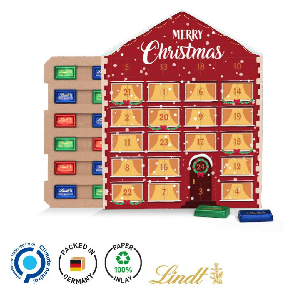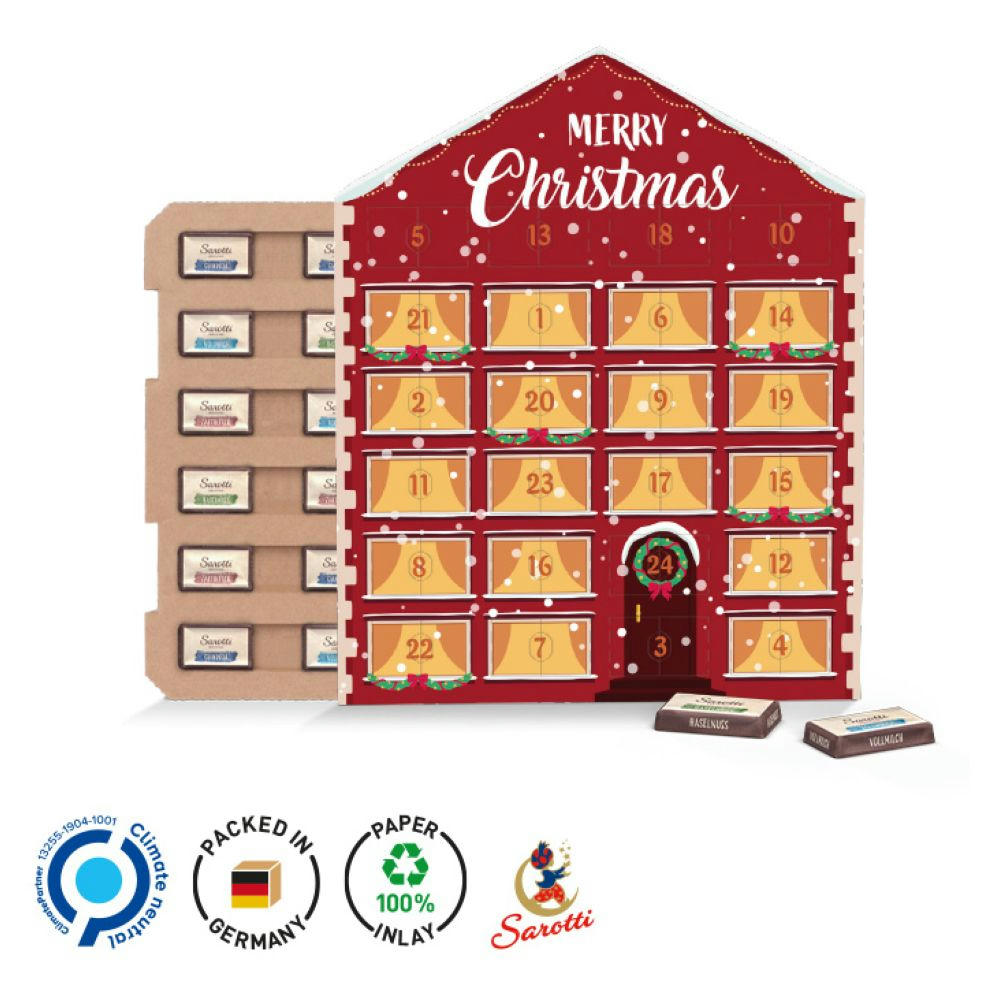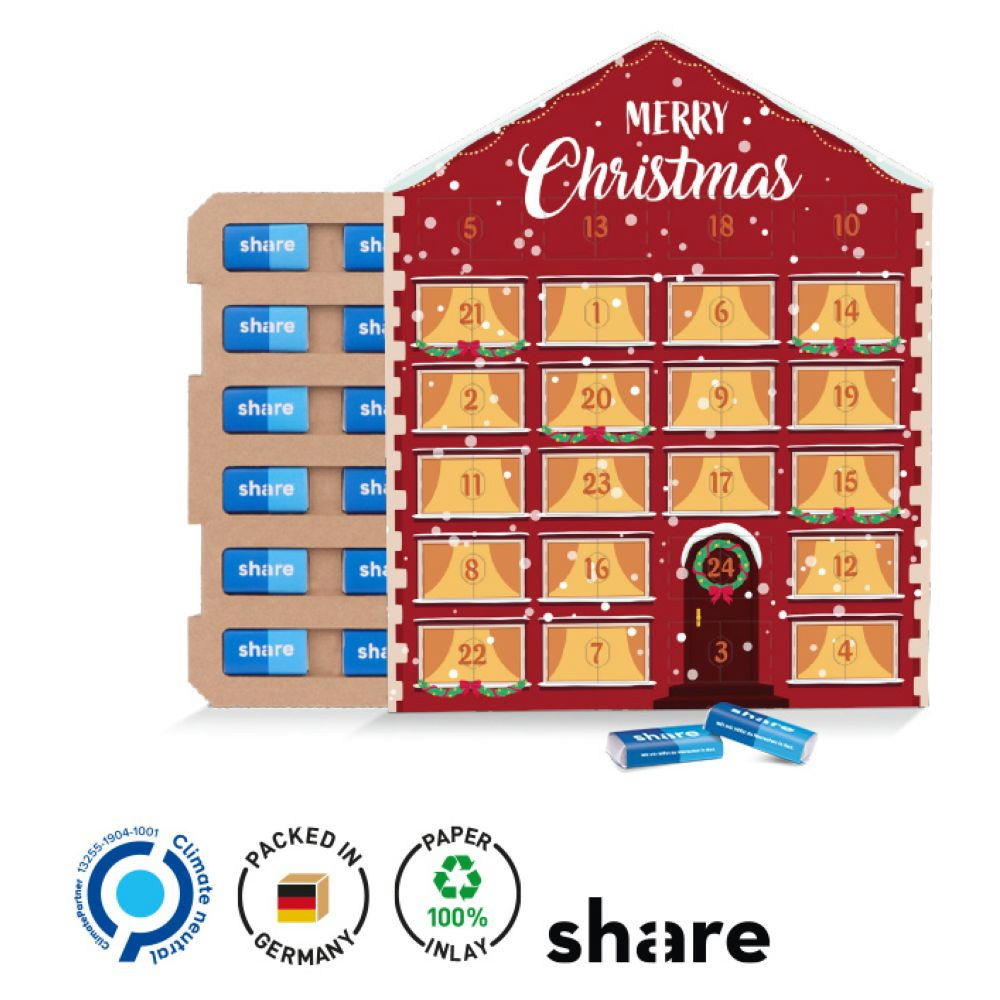 Täfelchen Kalender ECO in Hausform, Inlay aus 100 % Papier, Vollkartonhülle individuell bedruckt. Inhalt: 24 Alpenmilch-Schokotäfelchen mit Fairtrade-Zutaten, eingewickelt in Pergaminpapier (kann über die Papiertonne entsorgt werden), 72 g Saisonartikel - solange Vorrat reicht!