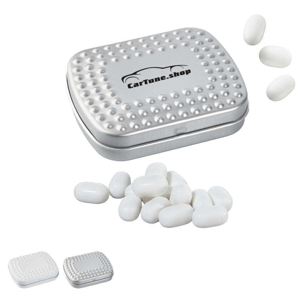 Metalldose rechteckig mit geprägtem Scharnierdeckel, wiederbefüllbar, einzeln gesleevt mit roter Aufreißhilfe. Inhalt: ca. 22 g TIC TAC FRESH MINTS von Ferrero. Alternative Füllvarianten: u.a. Pfefferminzpastillen, Pulmoll Pastillen auf Anfrage. Haltbarkeit: ca. 9 Monate.