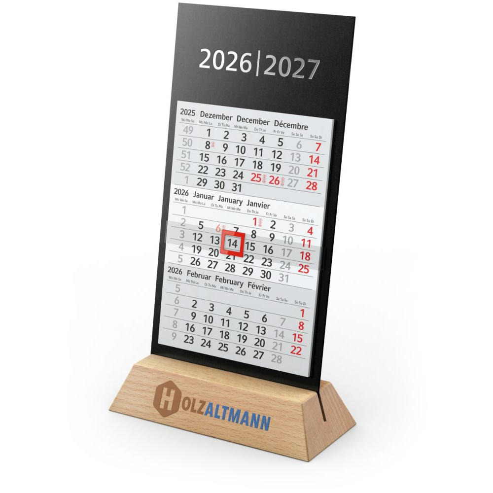 Tischkalender aus hochwertigem Buchenholz und schwarzer Kartonrückwand mit 2-Jahres-Kalendarium. Holzaufsteller. Kartonrückwand inkl. Jahreszahlprägung in Silber. Made in Germany. 4c-Druck auf Holzaufsteller inklusive.