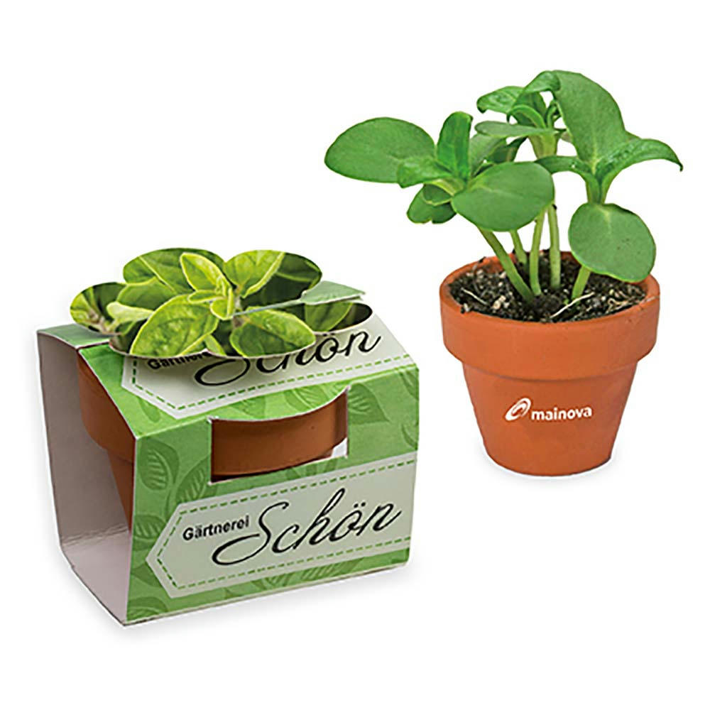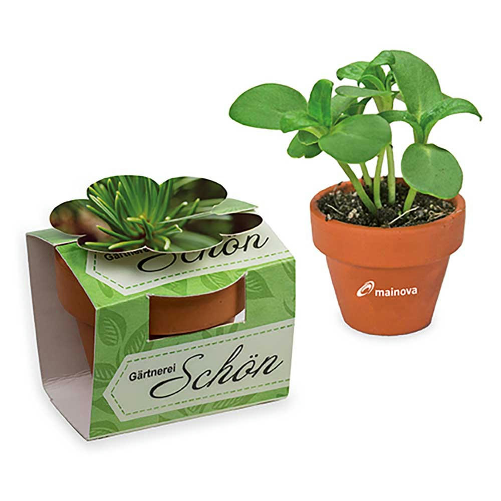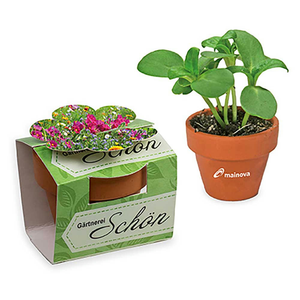 Das Tontöpfchen aus Terracotta wird mit unterschiedlichen Samen nach Wahl sowie einer Substrattablette als Erde geliefert. Die Banderole mit Steckverschluss in Form einer Blume macht das Produkt einzigartig und sympathisch. Die Werbebotschaft erfolgt durch die im Digitaldruck individuell bedruckte Banderole und optional durch einen einfarbigen Tampondruck auf dem Töpfchen.