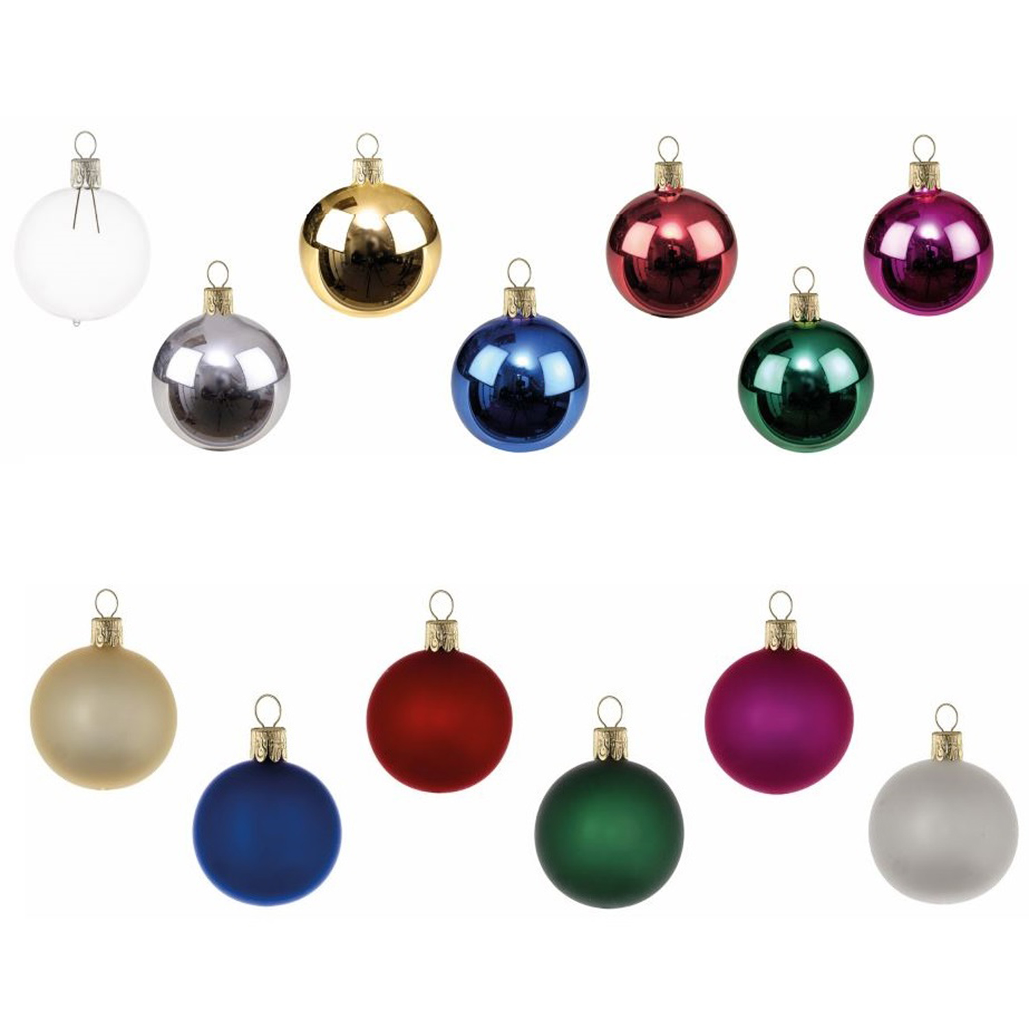 Formschöne, mundgeblasene und handdekorierte Glaskugeln. Zum Aufhängen der 8 cm großen Kugel ist eine Öse aus Aluminium befestigt, wahlweise silber- oder gold-farbig. Kugeln in glänzender oder matter Ausfertigung erhältlich. Bereits ab 250 Stück individuell bedruckbar. Made in Europe.