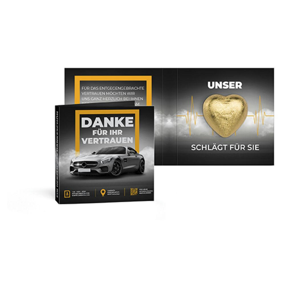 Werbeklappkarte individuell beidseitig bedruckt mit innenliegendem Lindt Herz aus Vollmilchschokolade (rot oder gold). Variante : Werbekarte mit Lindt Schokoladen Herz 5 g | rot | 4c Euroskala