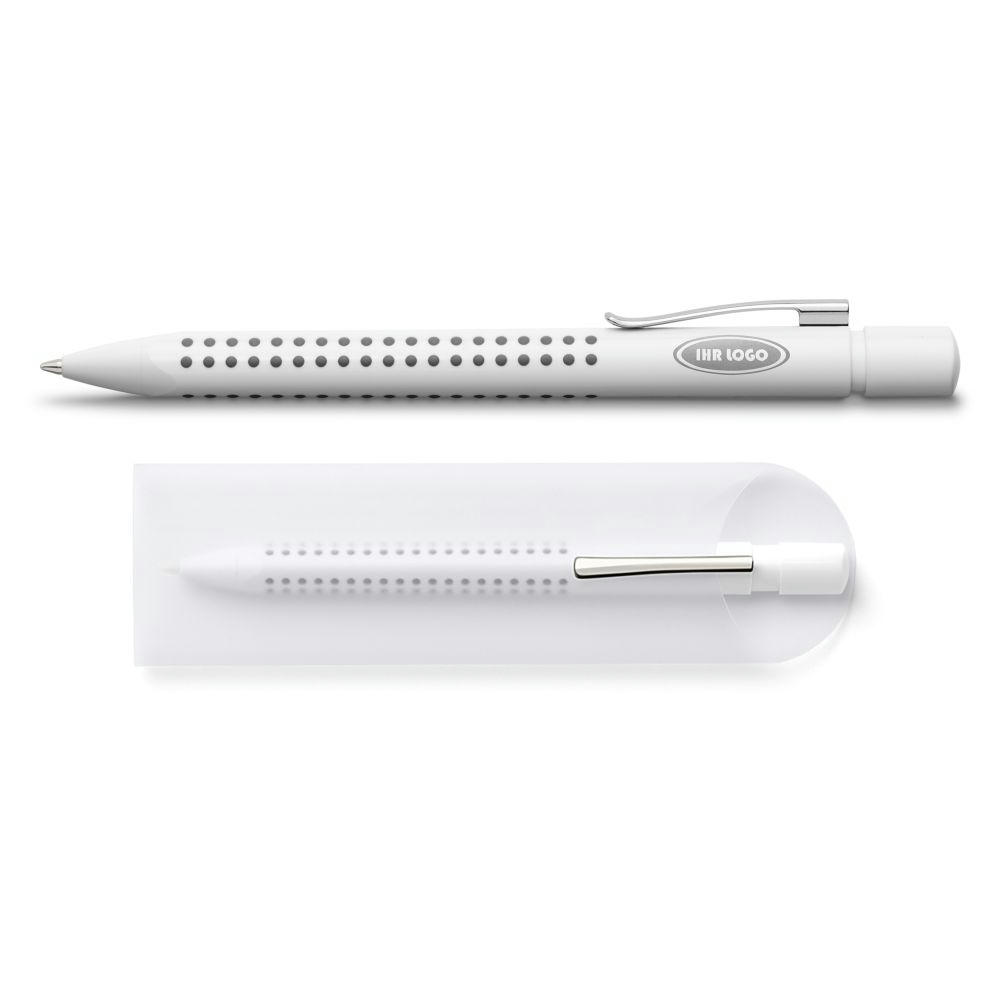 Druckkugelschreiber Grip 2010 in Weiss als erfolgreicher Teil der Grip-Familie. Schaft und Spitze aus Kunststoff, ergonomische Dreikantform mit Noppen, Metallclip mit dokumentenechter Kunststoffgrossraummine blau/M. MADE IN GERMANY. Einzeln im umweltfreundlichen Pergamin Stecketui (FSC-Material).